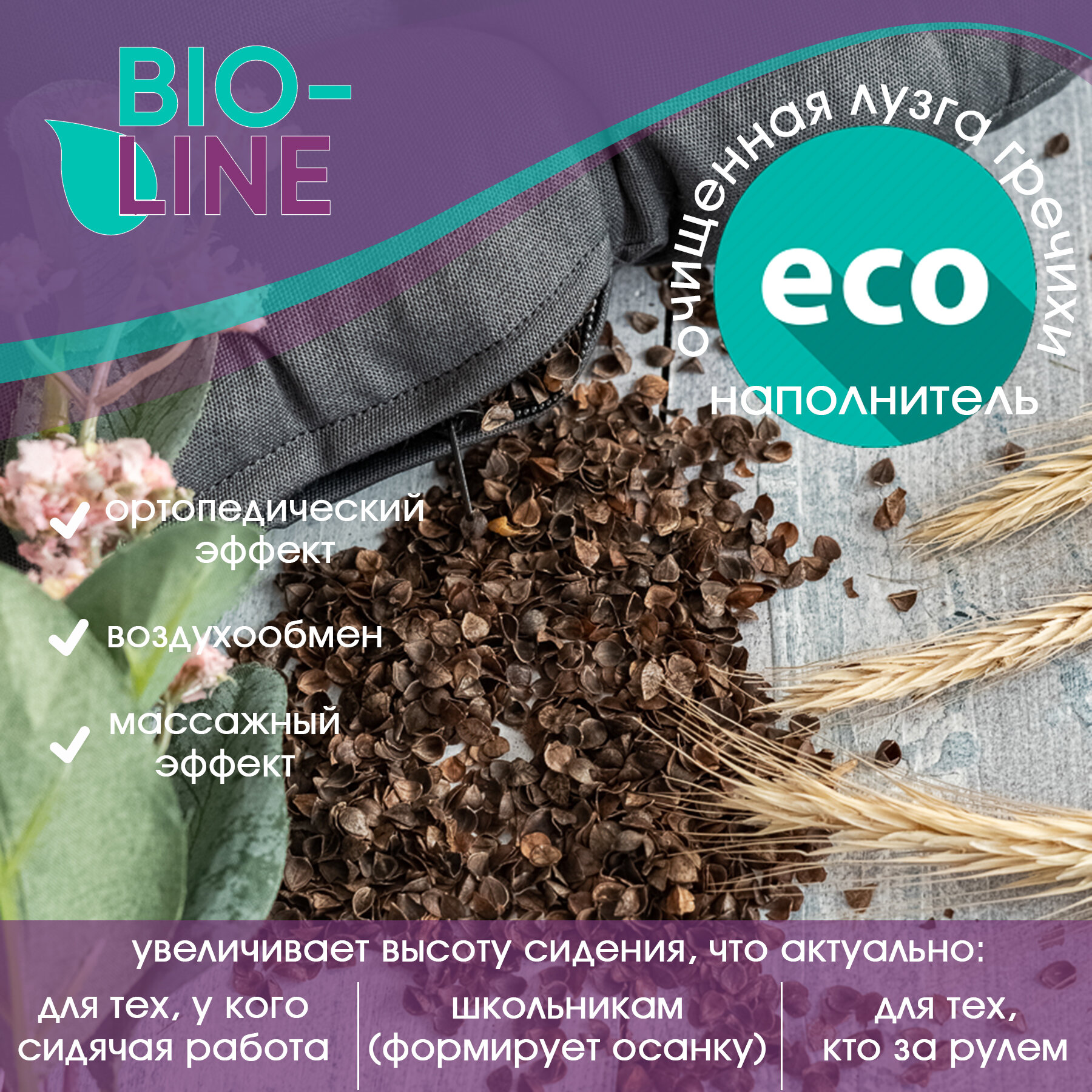 Ортопедическая подушка на стул с лузгой гречихи Bio-Line , универсальная, на сиденье офисного кресла, в автомобиль,40х40 см