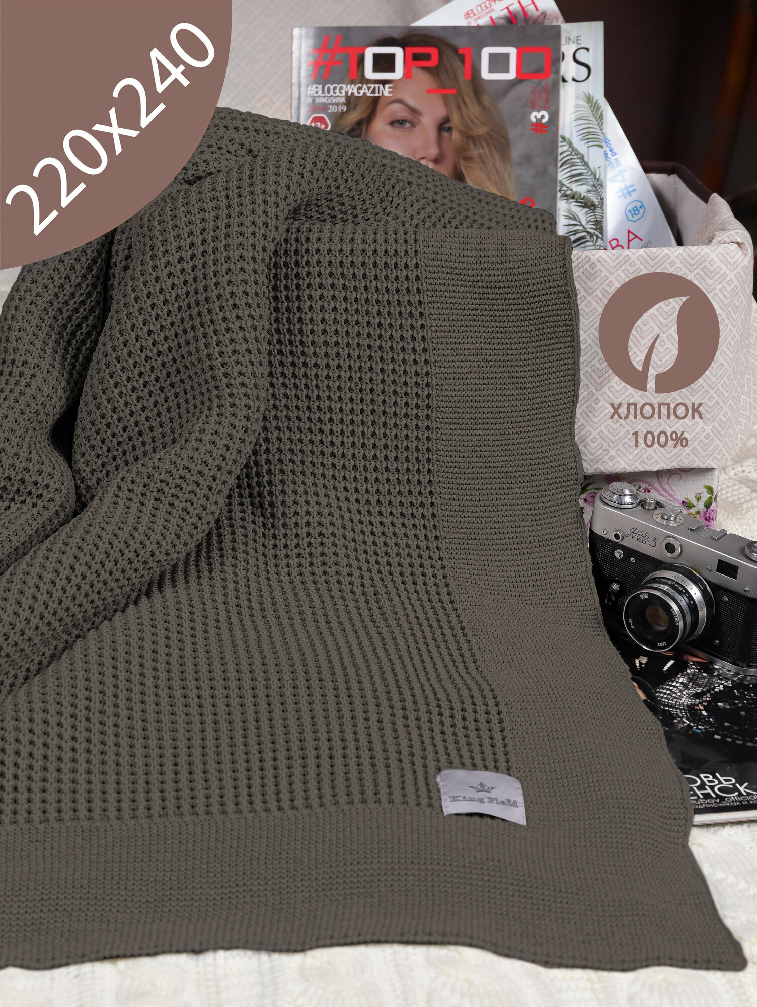 Плед 240x260, вязаный, KING PLAID, хаки, хлопок, покрывало на кровать, на диван, на кресло, в подарочной сумке 4 500 ₽