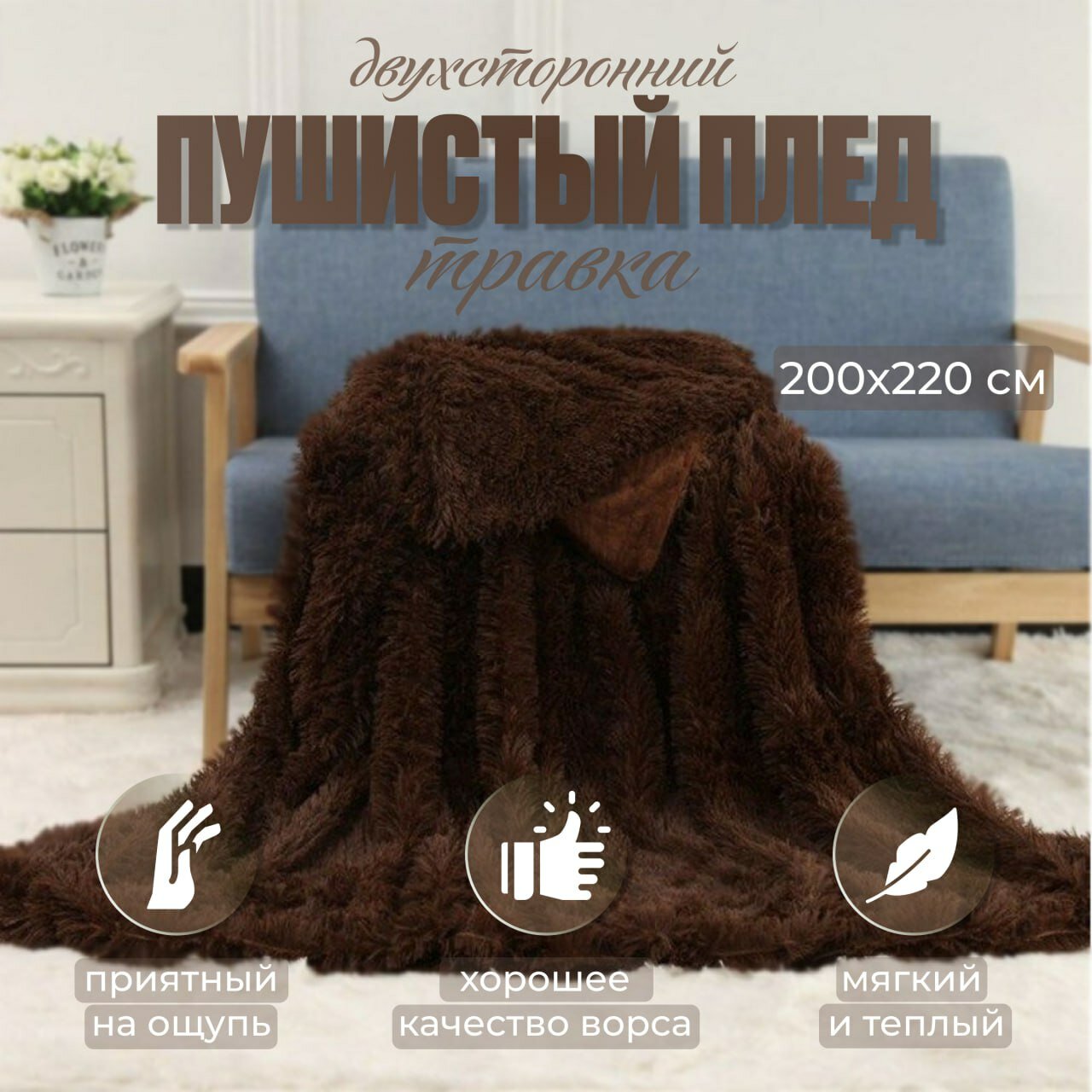 Плед Травка 200 x 220 см, двухсторонний пушистый с длинным ворсом, плед для дивана, плед на кровать, коричневый 1 907 ₽