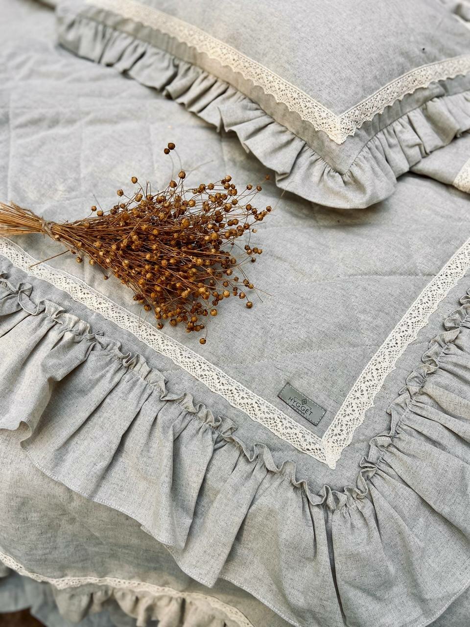 Льняное стеганое покрывало с рюшей и кружевом на кровать KATARINA, 235х225 см., Лен, плед информация: