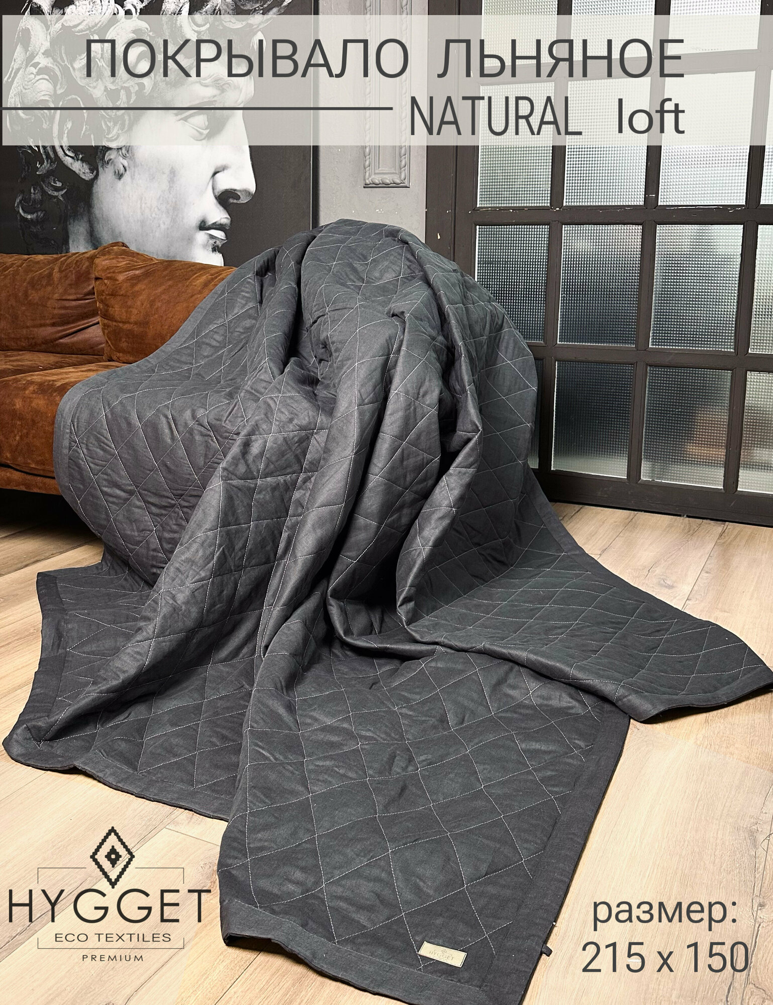 Отзывы на Дизайнерское льняное стеганое покрывало на кровать или диван Natural графит, 215*150 см., Лен, плед