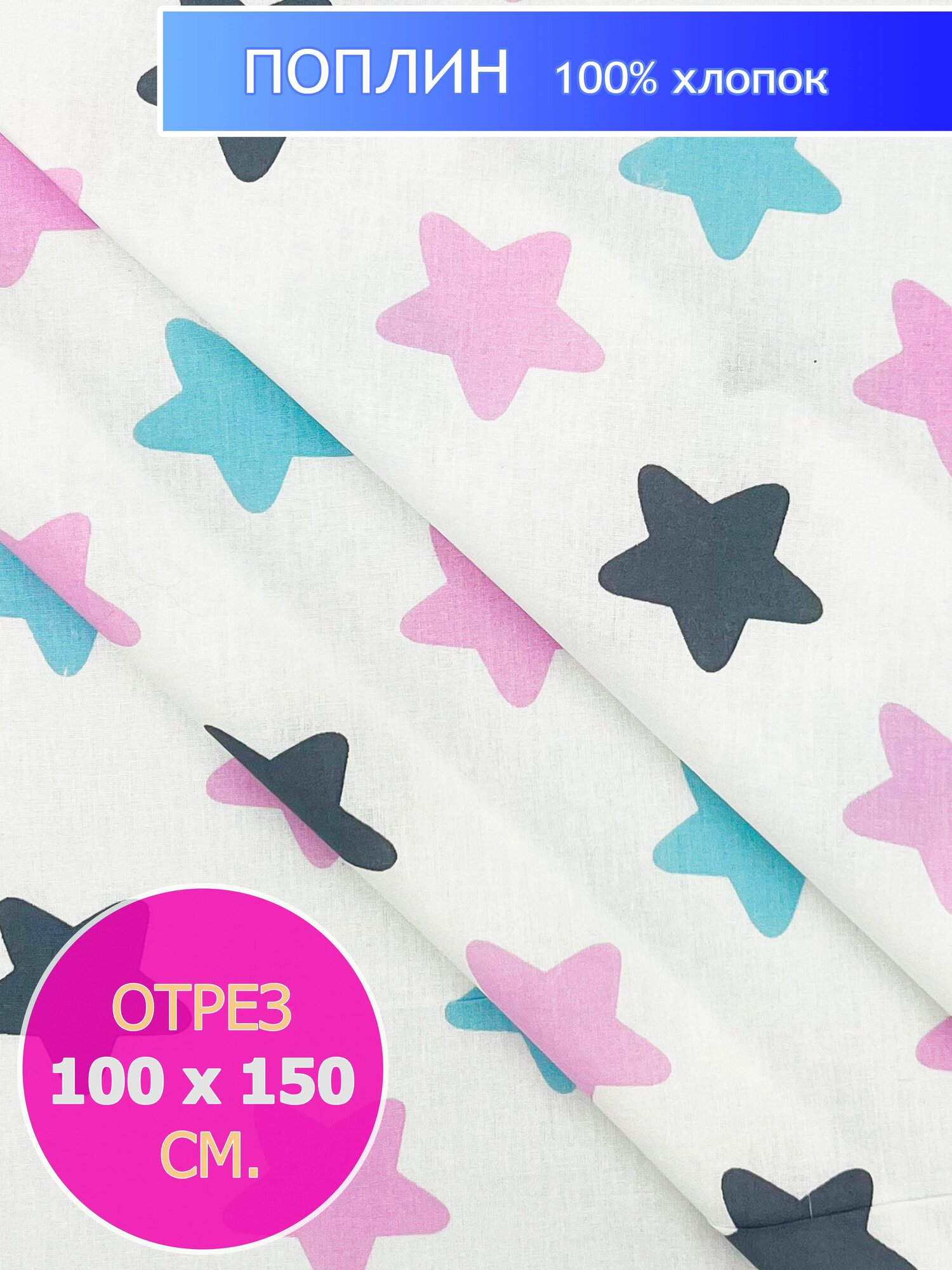 Ткань хлопковая Поплин, Звезды на Синем, отрез 1х1,5 м 352 ₽
