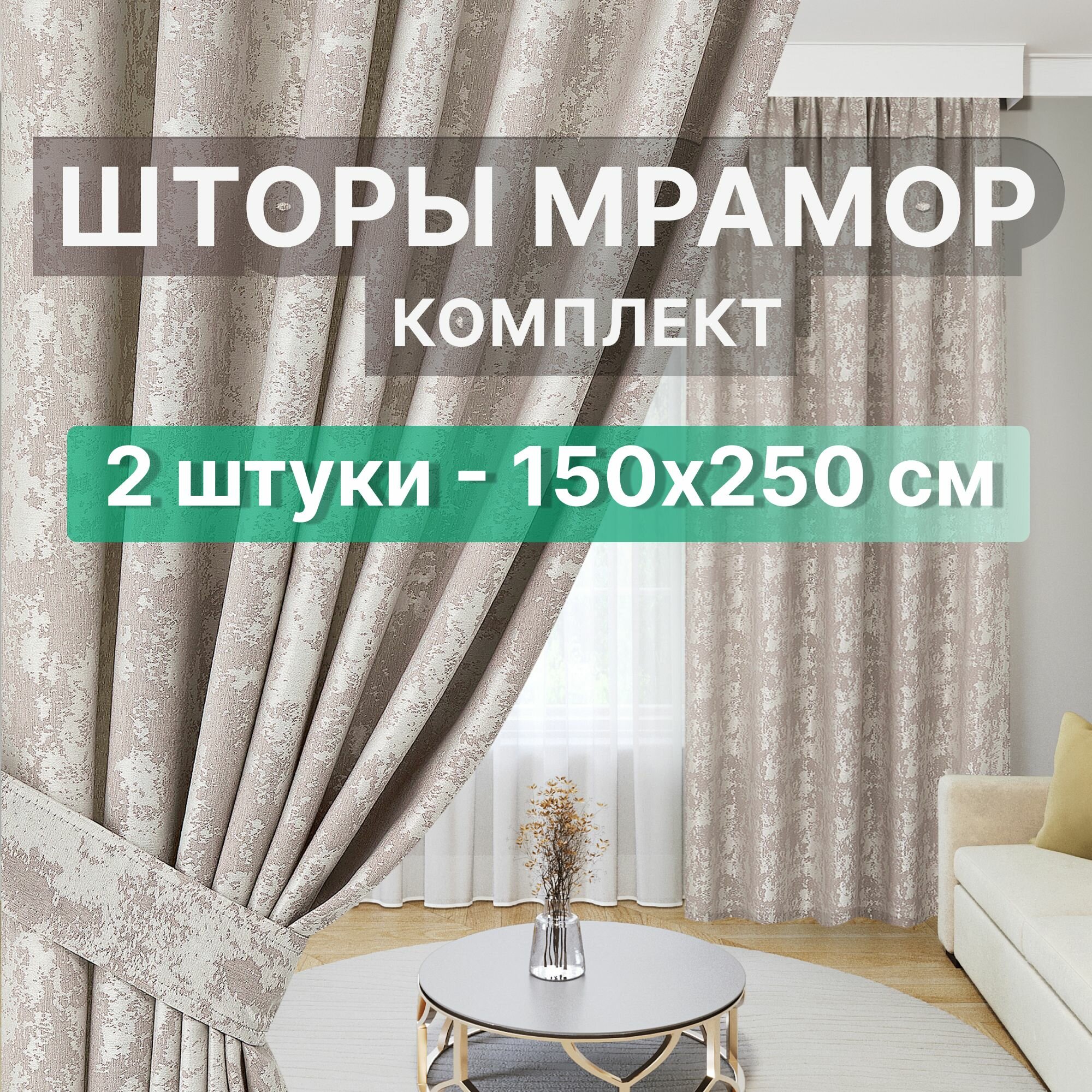 10 цен на Комплект штор мрамор 300х250 / Комплект 2 штуки по 150 см ширина 250 см высота / бежевый / Шторы для комнаты серые / Портьеры набор из двух штук 3 метра