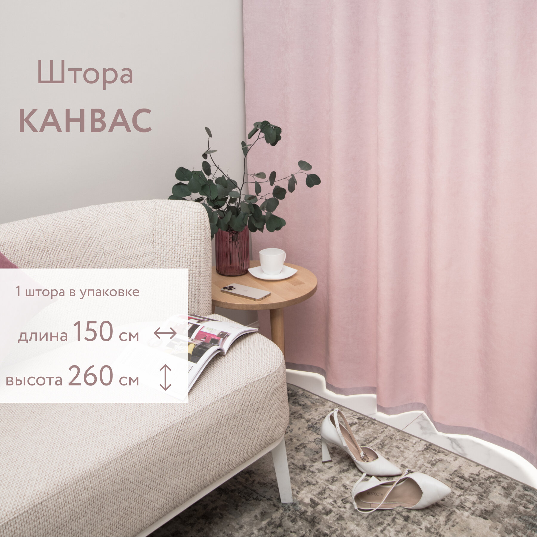 Портьера Канвас 150х260 см, пудра. Штора интерьерная для комнаты, кухни, гостиной, детской 2 600 ₽