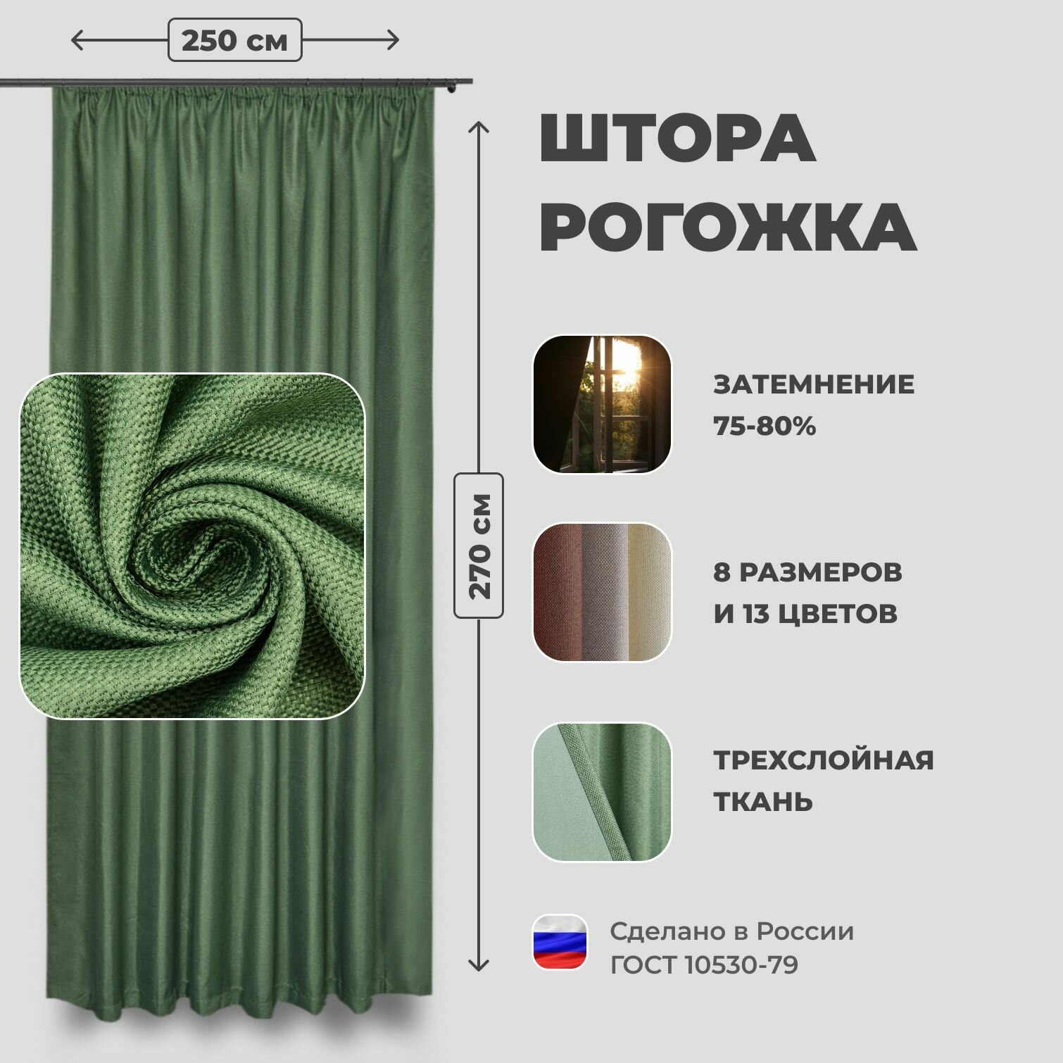10 цен на Штора для комнаты 250x270 см Блэкаут рогожка Shtoraland на ленте для крючков, одна портьера для гостиной, спальни, детской. Зеленый цвет