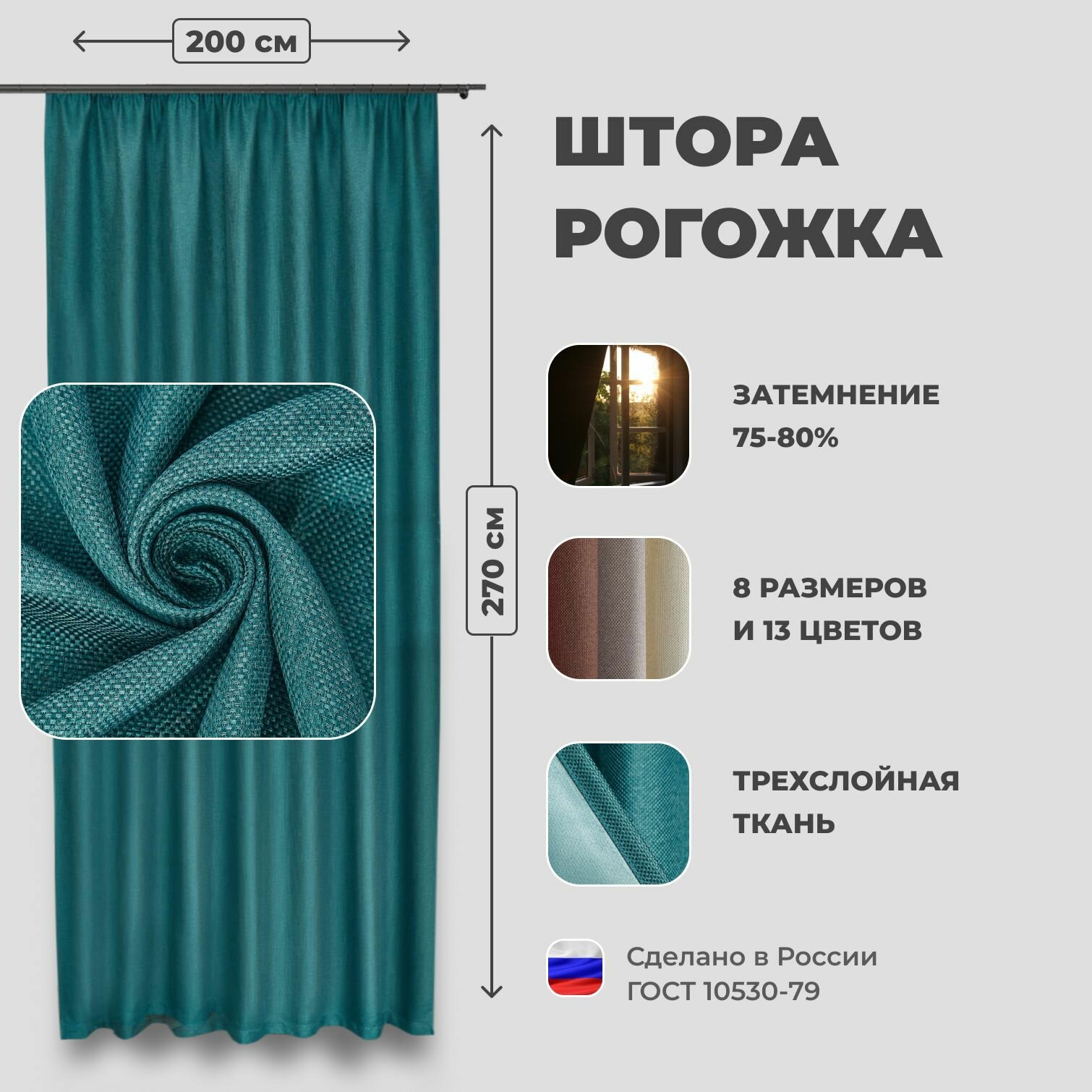 Отзывы на Штора для комнаты 200x270 см Блэкаут рогожка Shtoraland на ленте для крючков, одна портьера для гостиной, спальни, детской. Бирюзовый цвет