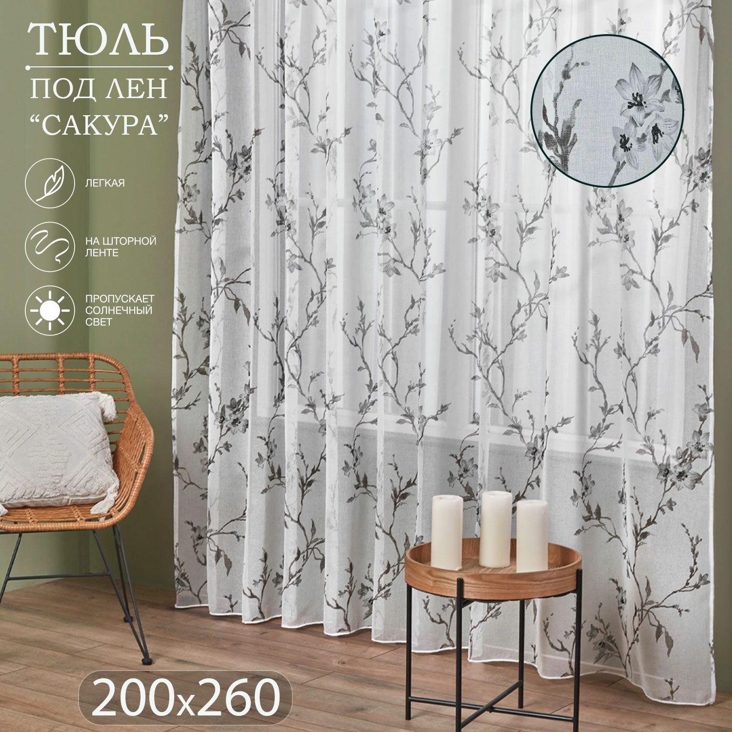 Готовый тюль под лен на шторной ленте с утяжелителем ширина 200 см высота 260 см; вуаль с рисунком 2 м информация: