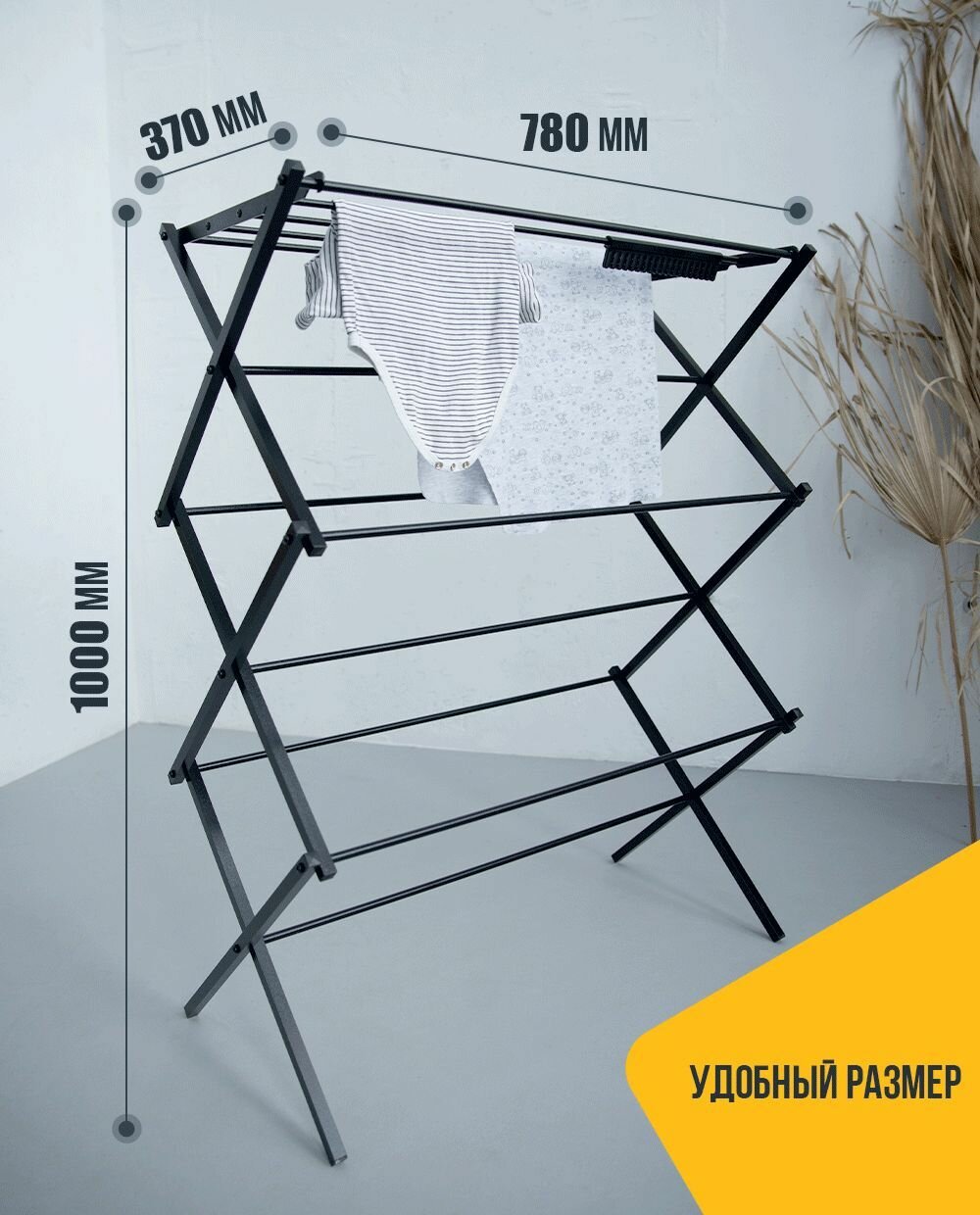 Сушилка для белья напольная складная Bilmann, сушилка вертикальная, металлическая, 1000х780х370 мм, с толстыми прутьями, черная информация: