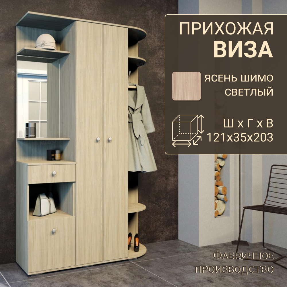 Комплект прихожей Виза со шкафом, с полками, с зеркалом, с вешалкой, 120х35х203 см, Ясень Шимо / Ясень Шимо светлый 11 246 ₽