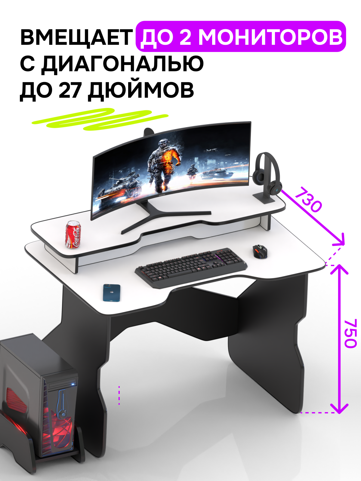 Игровой компьютерный стол для геймера белая столешница черный кант и черные ноги с полкой под монитор 106х73х75 информация: