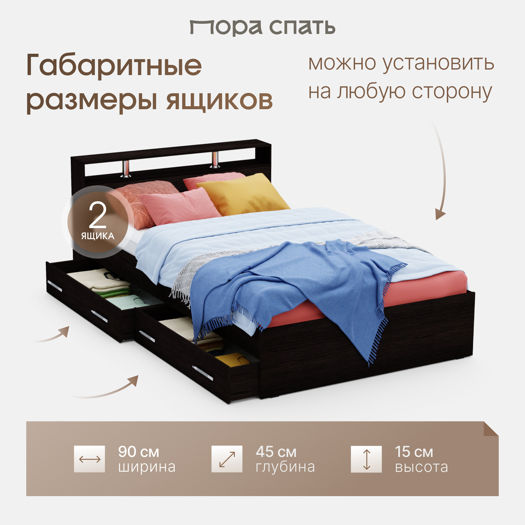 10 цен на Кровать Пора Спать Арина с ящиками и основанием ДСП, Венге, спальное место: 200х90 см, габариты: 220х97 см