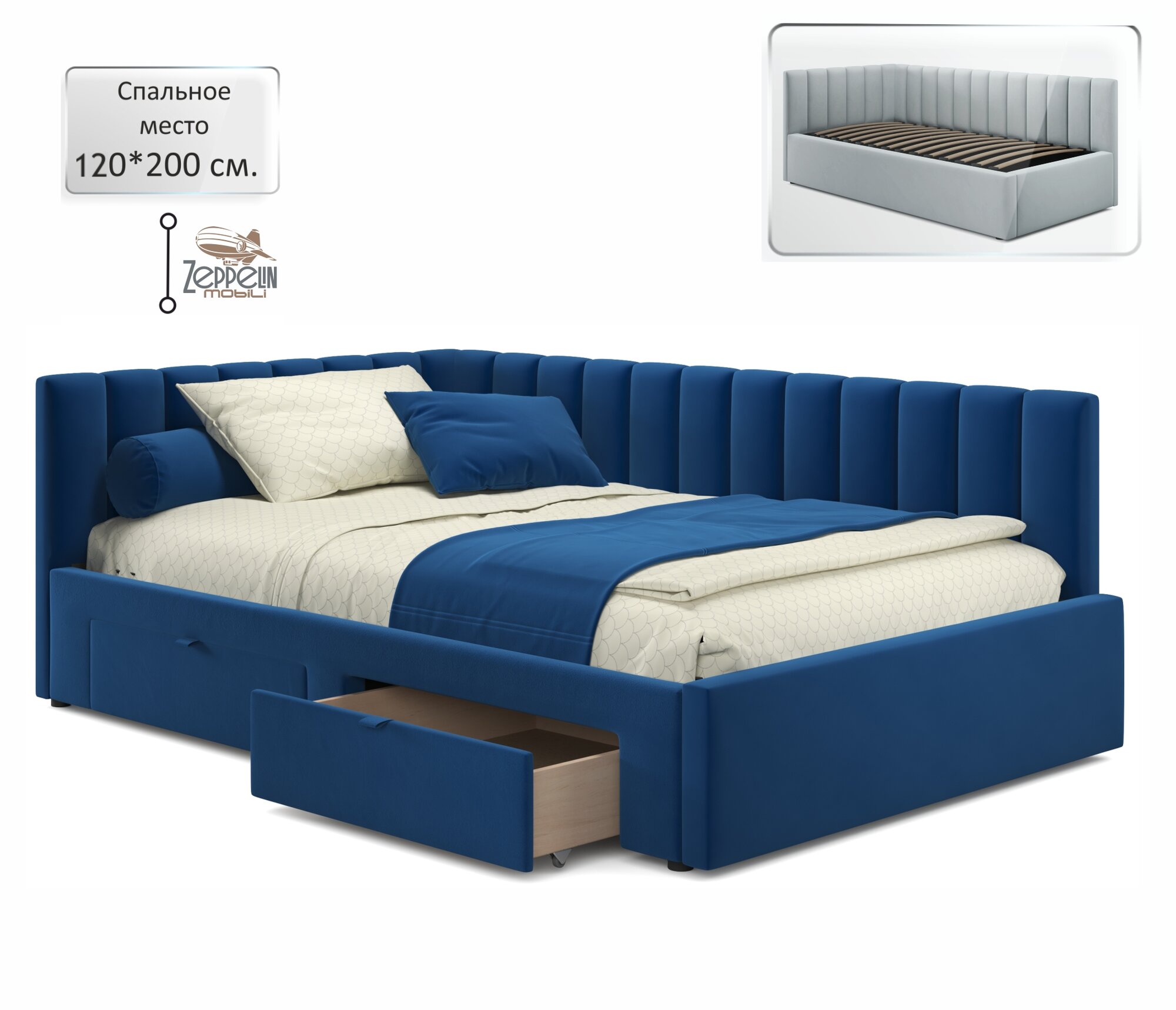 Кровать-тахта Milena 120х200 синяя с ящиками, 120х200, мягкая спинка из велюра, с ортопедическими ламелями, с ящиками для хранения информация: