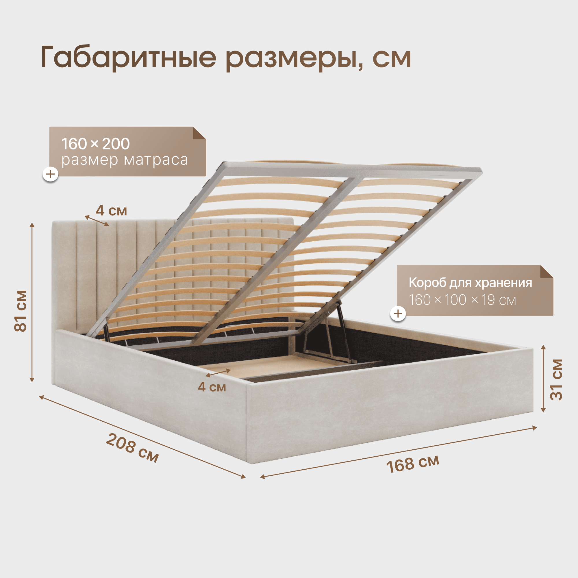 Кровать Пора Спать, Мила, с подъемным механизмом, спальное место: 160х200см, габариты: 168х208см, цвет: бежевый информация: