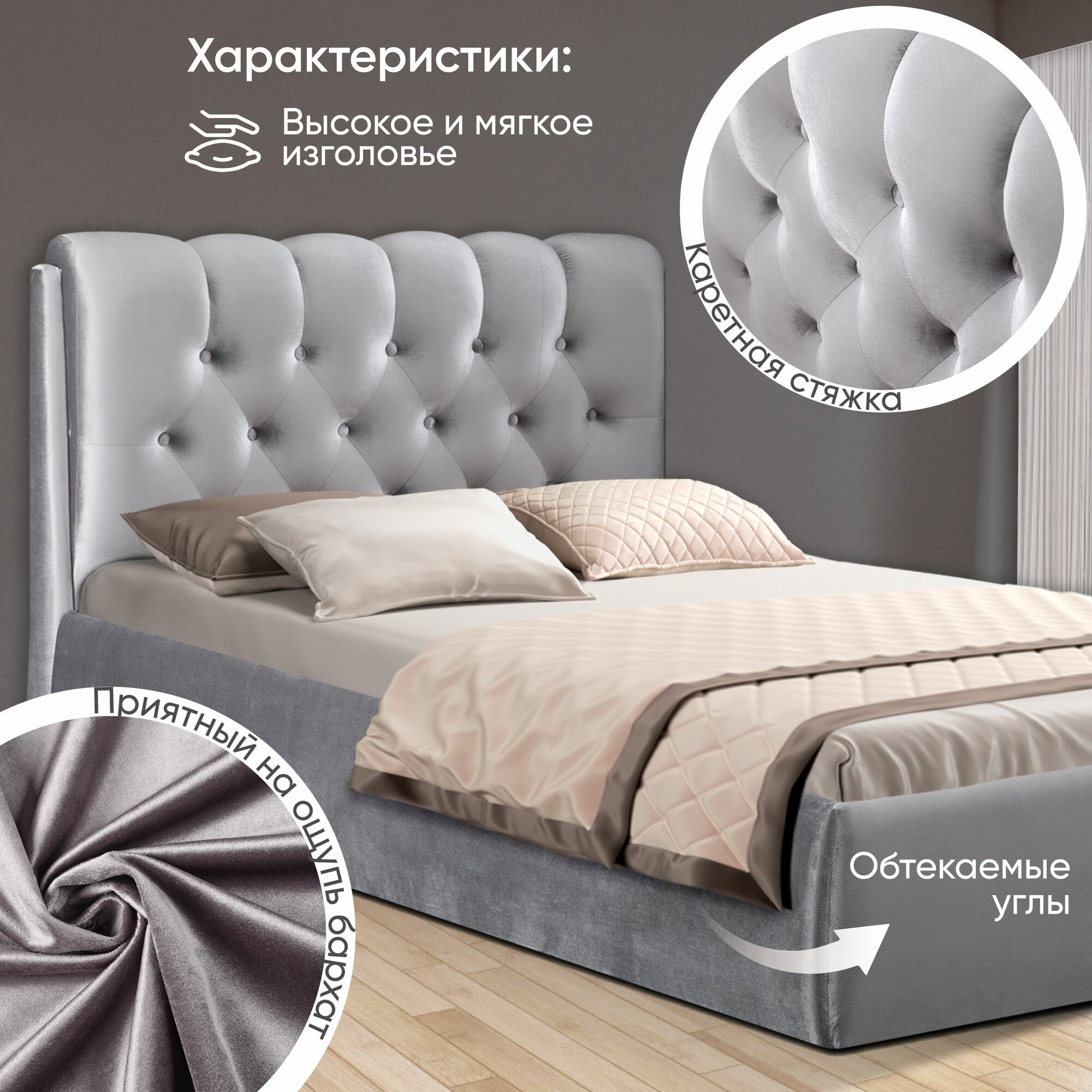 Двуспальная кровать 140х200 см с подъемным механизмом Империя для дома и спальни, бархат серый, Ами Мебель 24 999 ₽