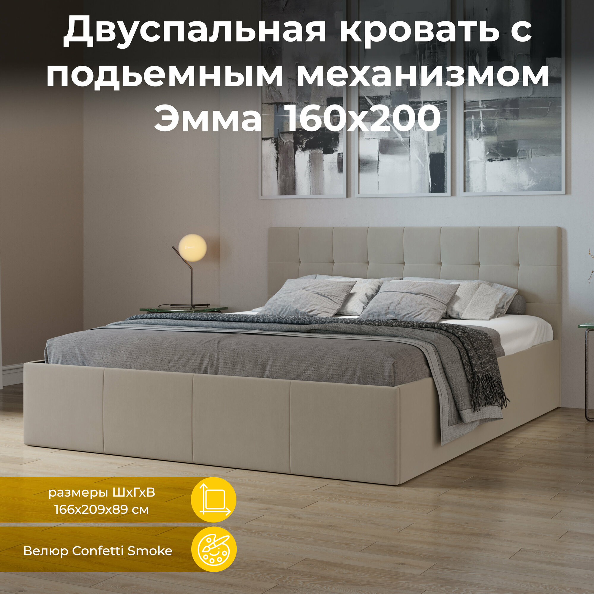 Кровать с подъемным механизмом, с мягкой обивкой и заглушиной бежевая 160х200 Эмма (Велюр Confetti Smoke) информация: