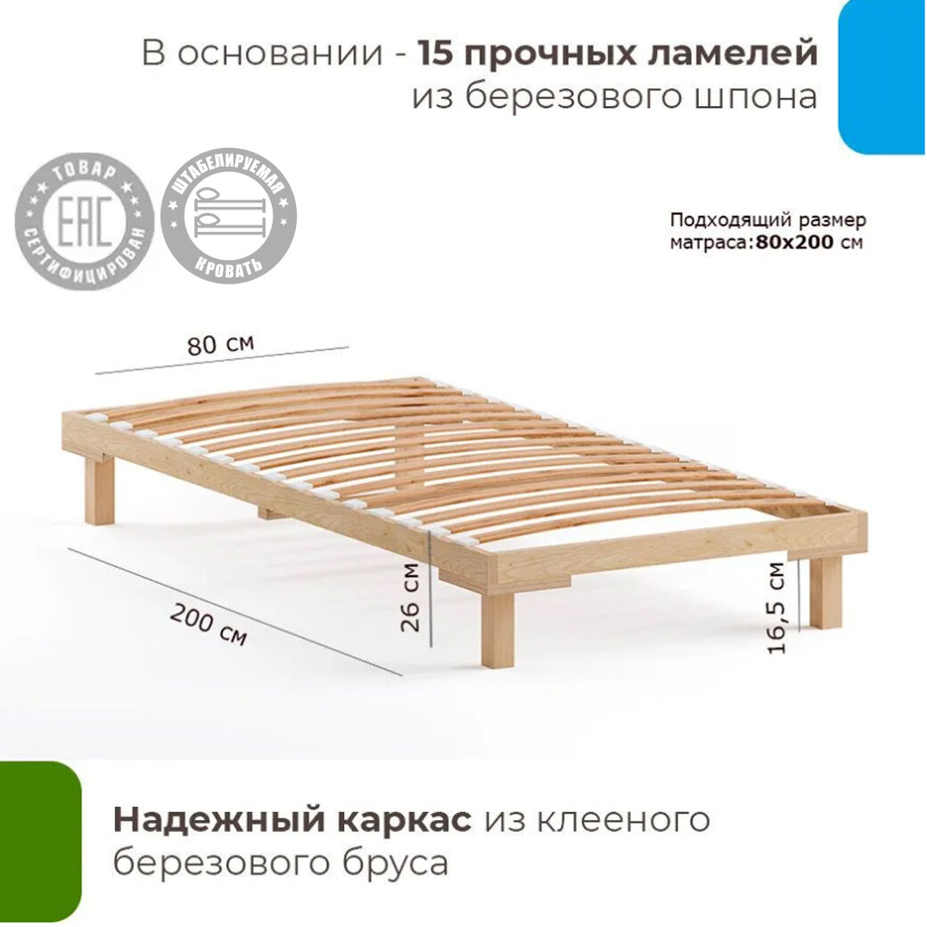 Кровать деревянная без спинки Канапе Люкс Альфафлекс 80х200, цвет натуральный 12 515 ₽