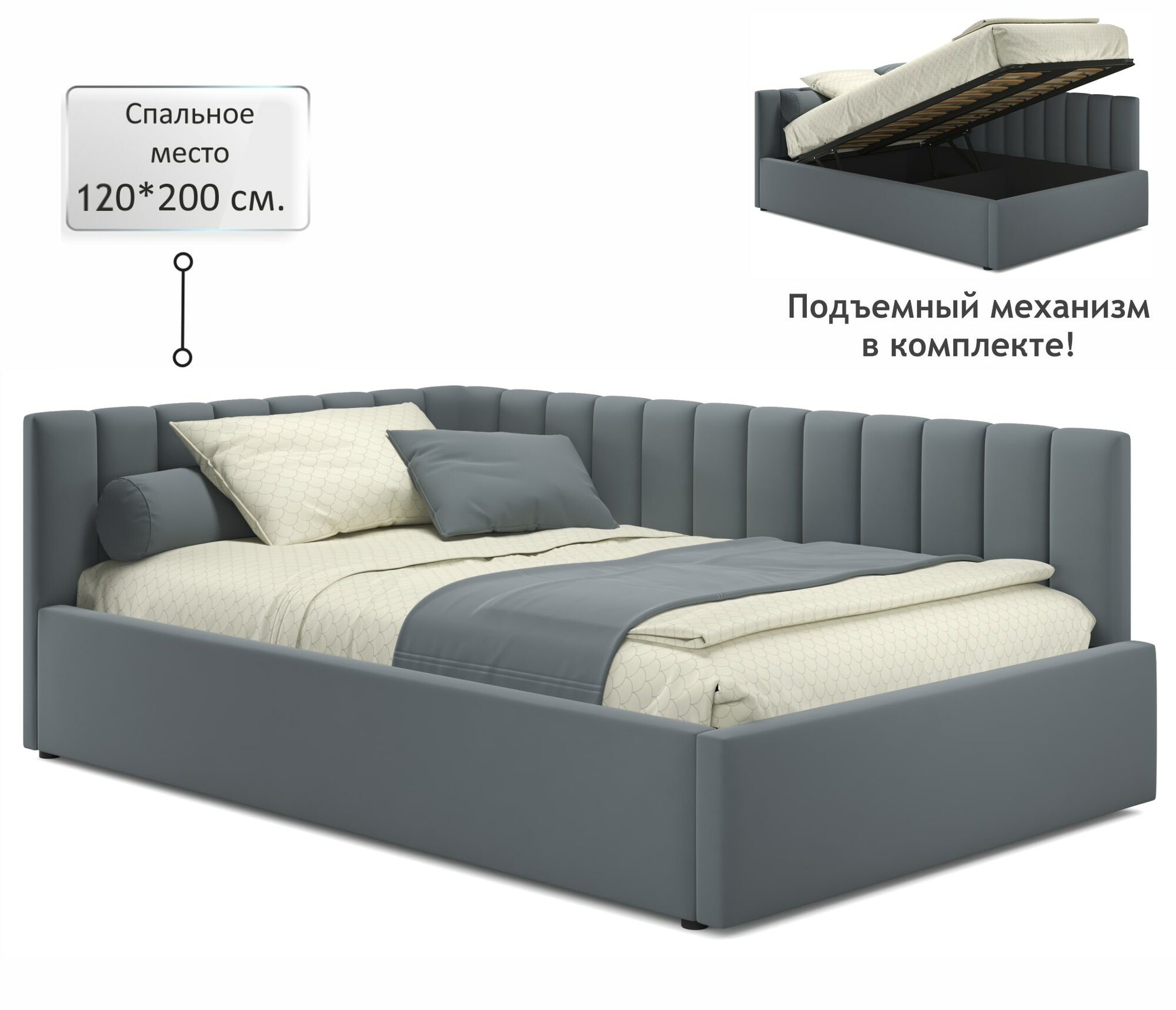 Кровать-тахта Milena 120х200 серая подъемная, мягкая спинка из велюра, с ортопедическими ламелями, с ящиком для хранения информация: