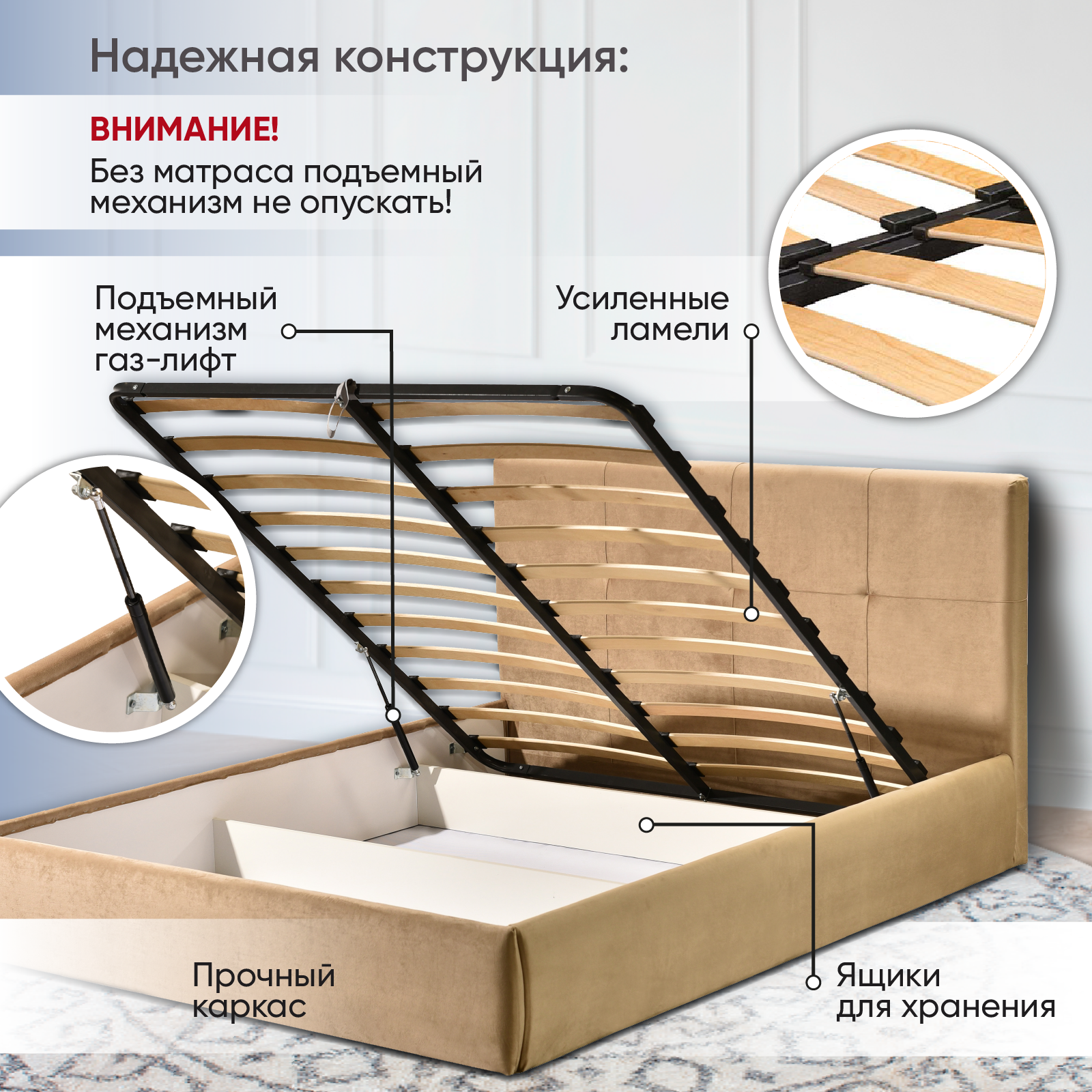 Двуспальная кровать 160х200 см Прима Люкс, подъемный механизм, ортопедическое основание, усиленные ламели, ниша для белья, вельвет бежевый, Ами Мебель Беларусь информация: