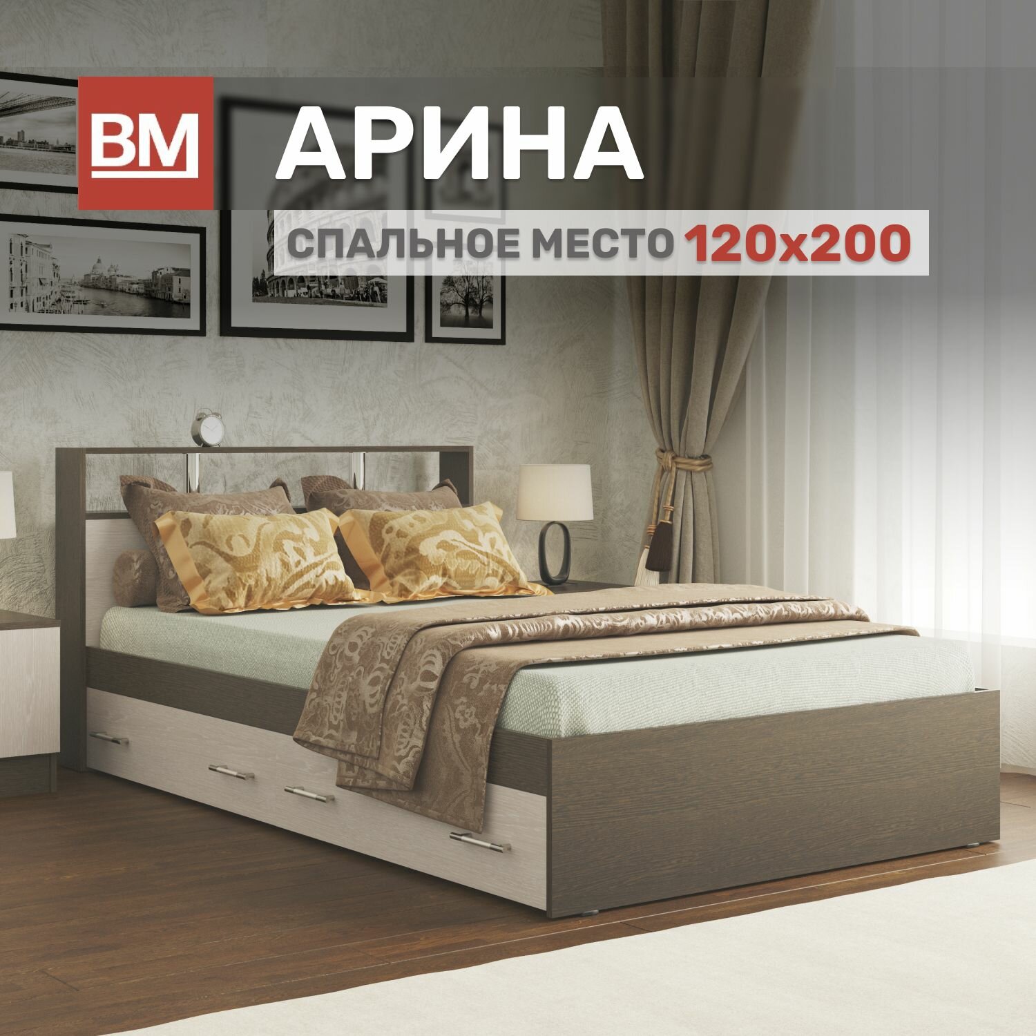 10 цен на Кровать полутороспальная арина 120х200, Венге/ Дуб молочный с ящиками