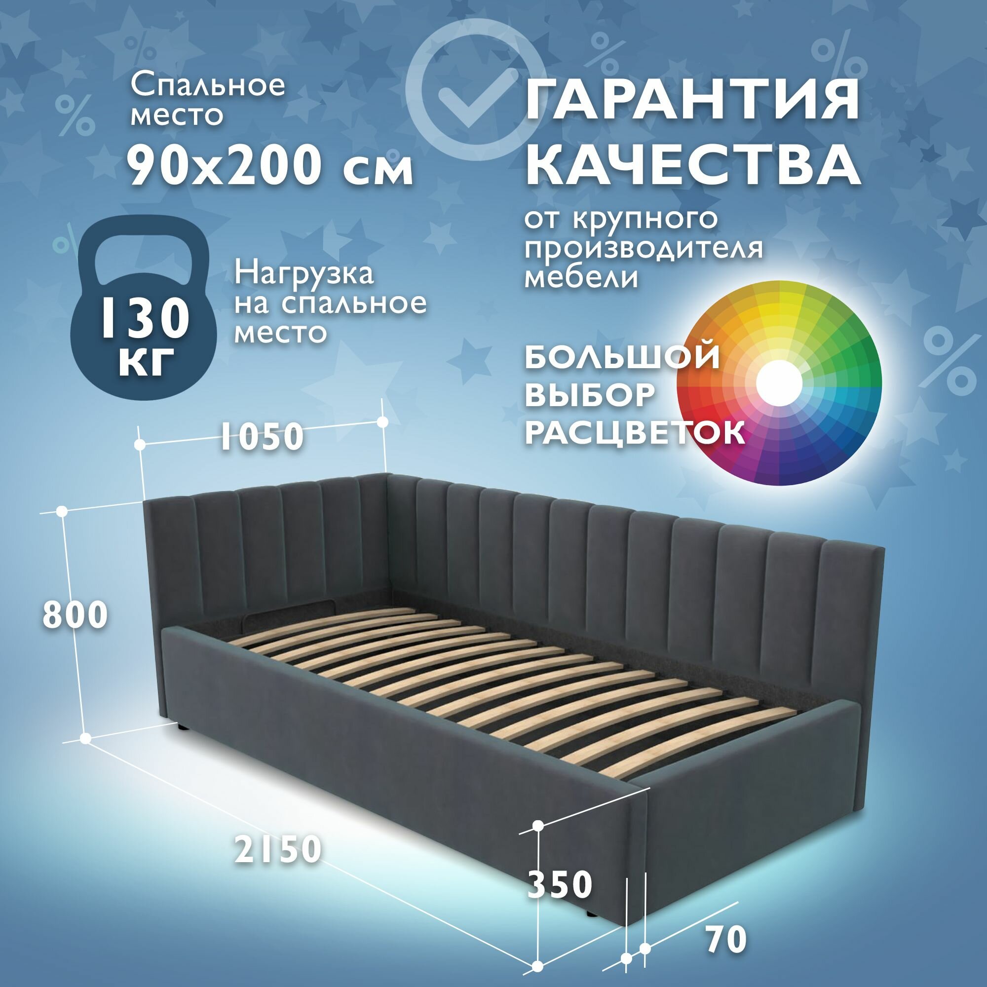 Односпальная угловая кровать c матрасом, Тахта 90х200 с мягкой спинкой "MERLIN-GRAFIT" детская, для подростков, диван информация: