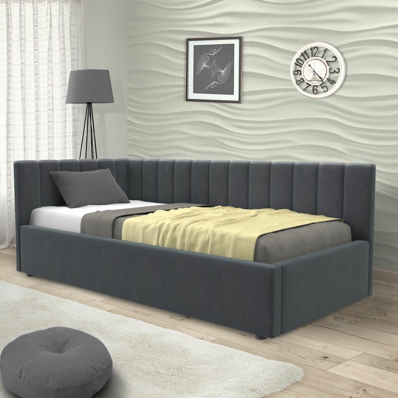 10 цен на Односпальная угловая кровать c матрасом, Тахта 90х200 с мягкой спинкой "MERLIN-GRAFIT" детская, для подростков, диван