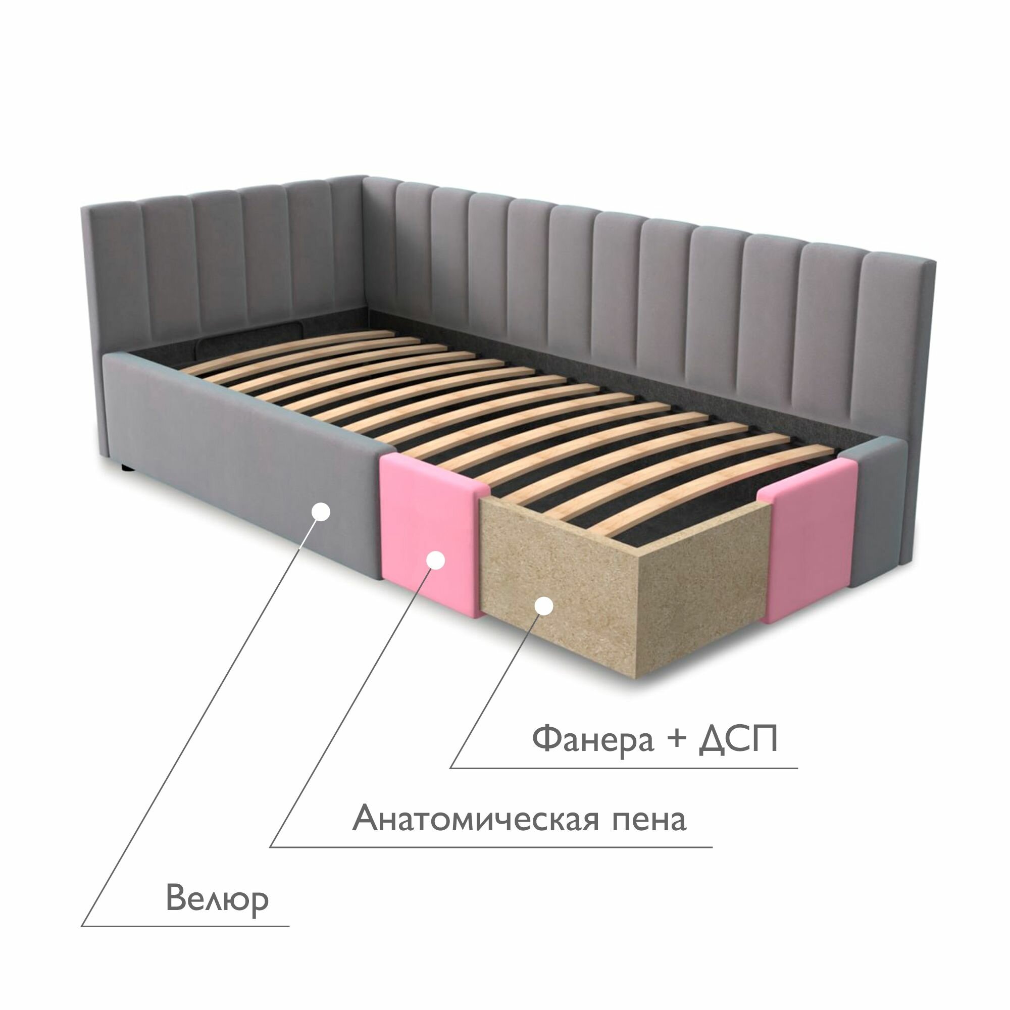 Односпальная угловая кровать с матрасом, Тахта 90х200 с мягкой спинкой "MERLIN-GREY" информация: