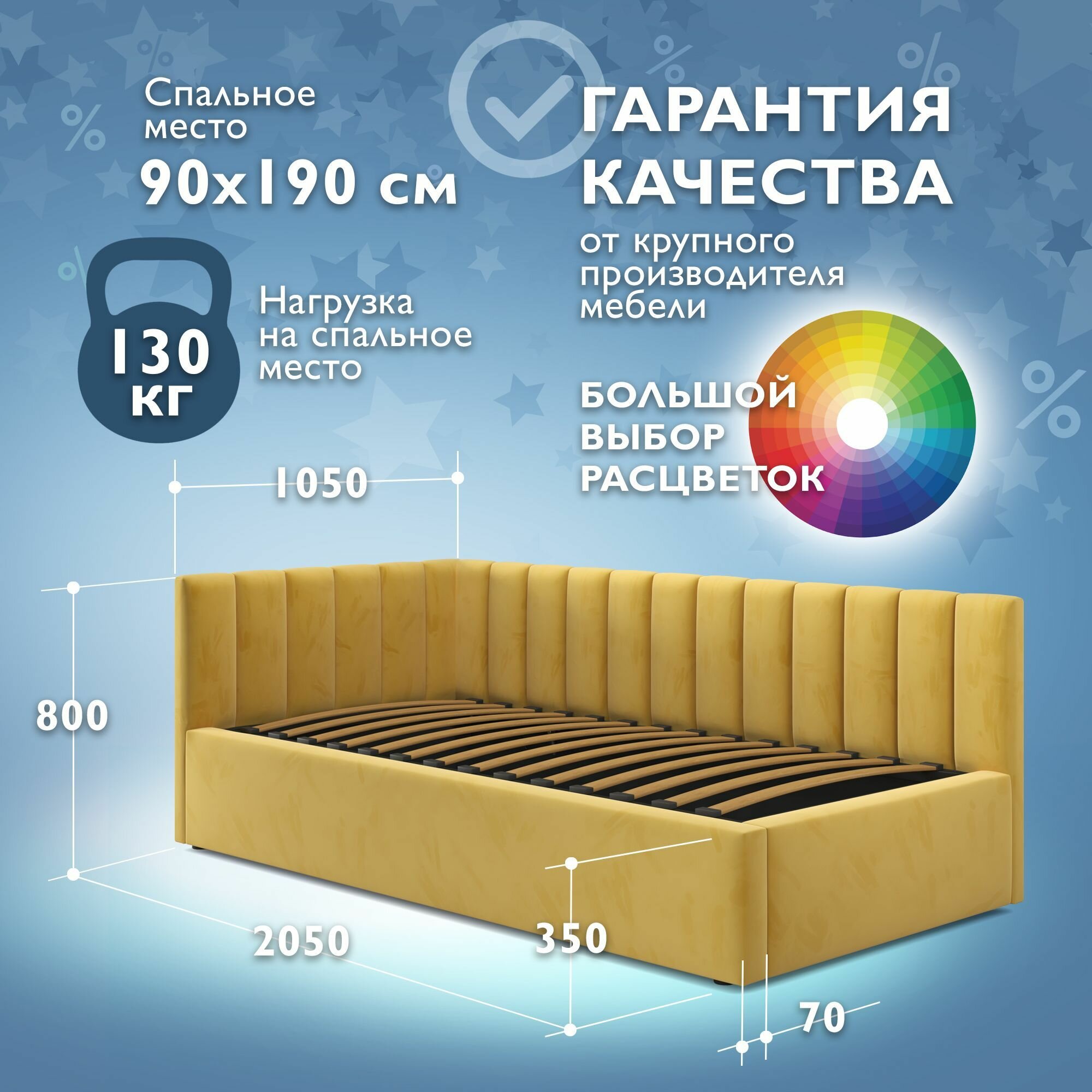 Кровать 90х190 односпальная с матрасом, угловая тахта с мягкой спинкой "MERLIN-LEMON" детская информация:
