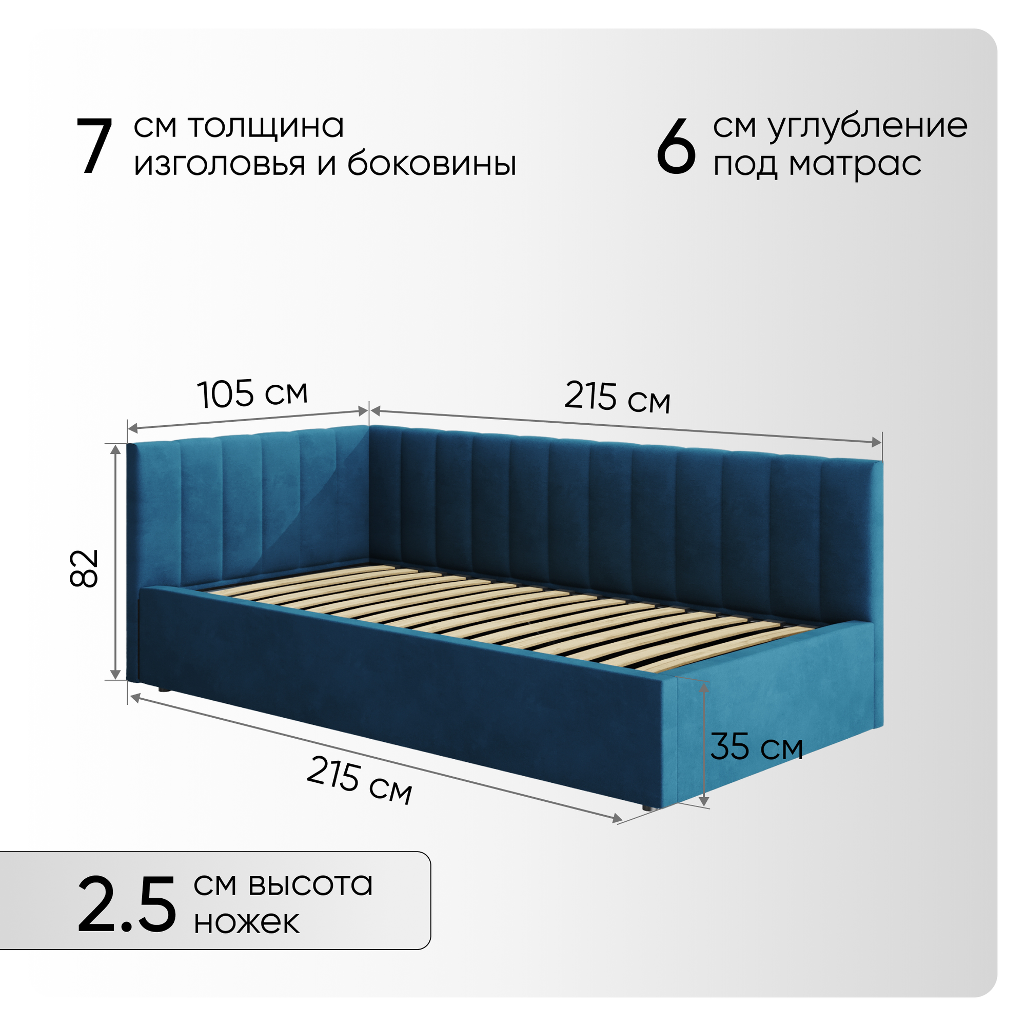 Односпальная угловая кровать 90х200 "Юлия" Синий-Велюр информация: