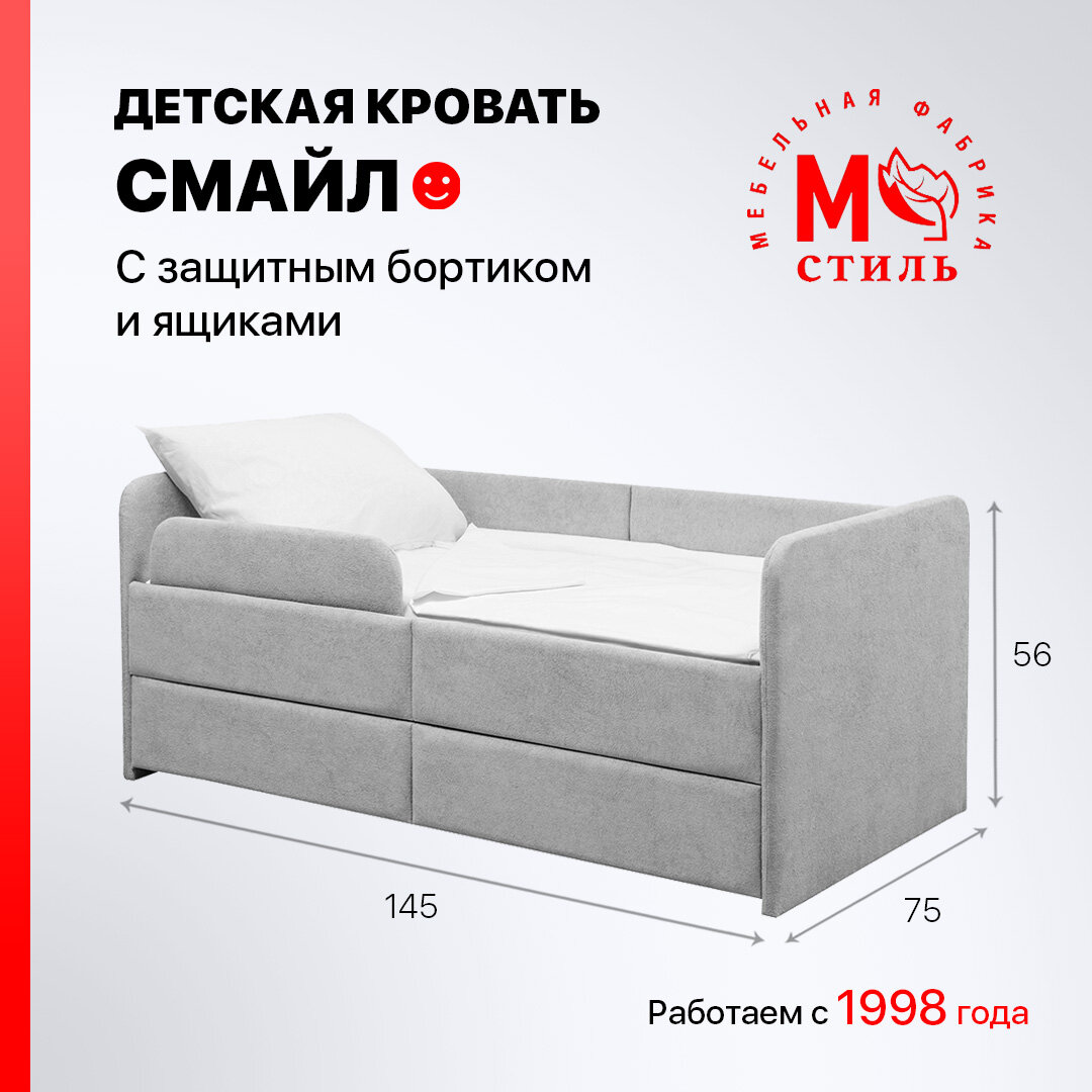 Отзывы на Кровать детская Смайл серая с защитным бортиком и ящиками для хранения 1400*700