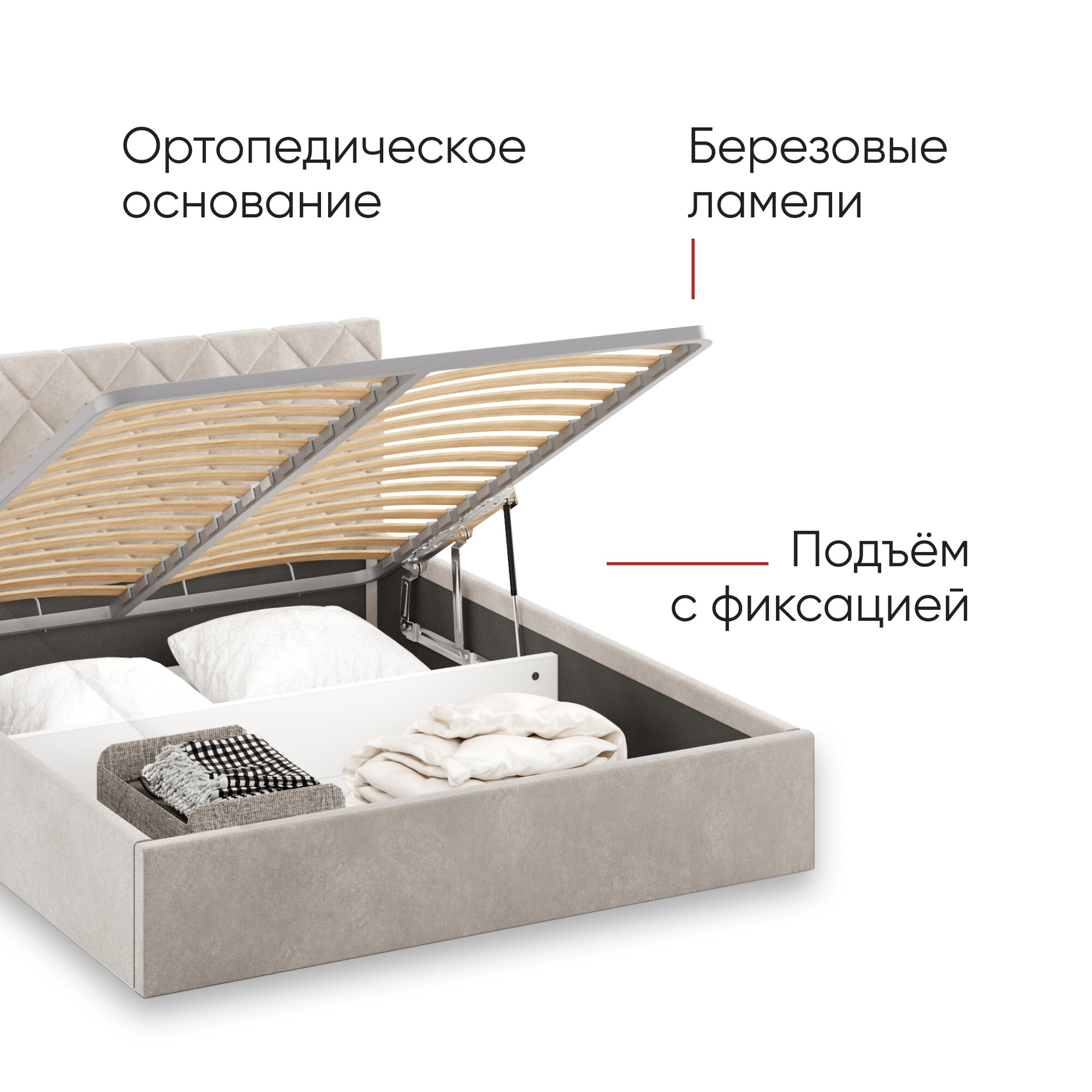| Особенности | мягкое изголовье, с подъемным механизмом, с ящиком для белья |