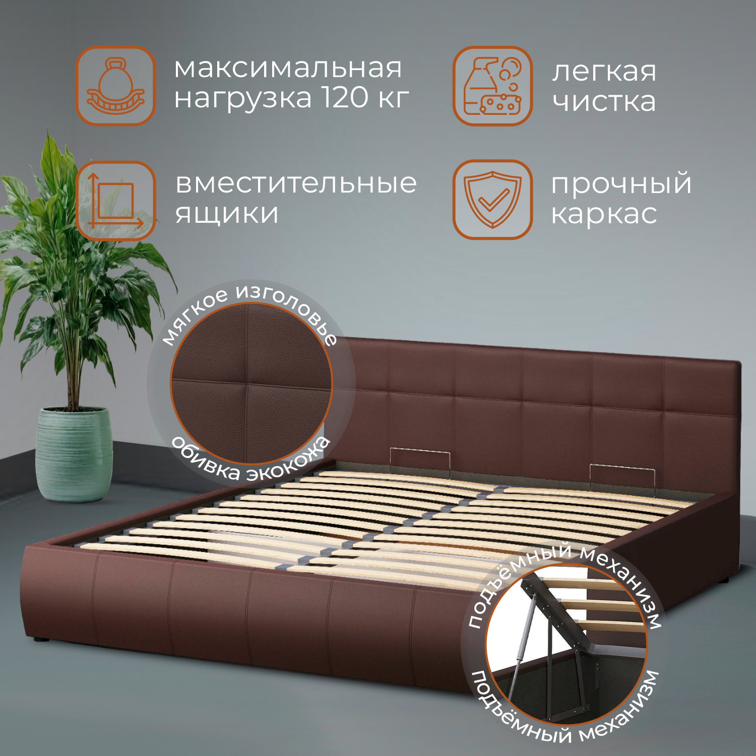 Отзывы на Кровать 180х200 с подъемным механизмом, двуспальная Венера-1 с мягким изголовьем для дома, для спальни, Ортопедическое основание, ящик для белья, коричневая экокожа, GALAXY Мебель