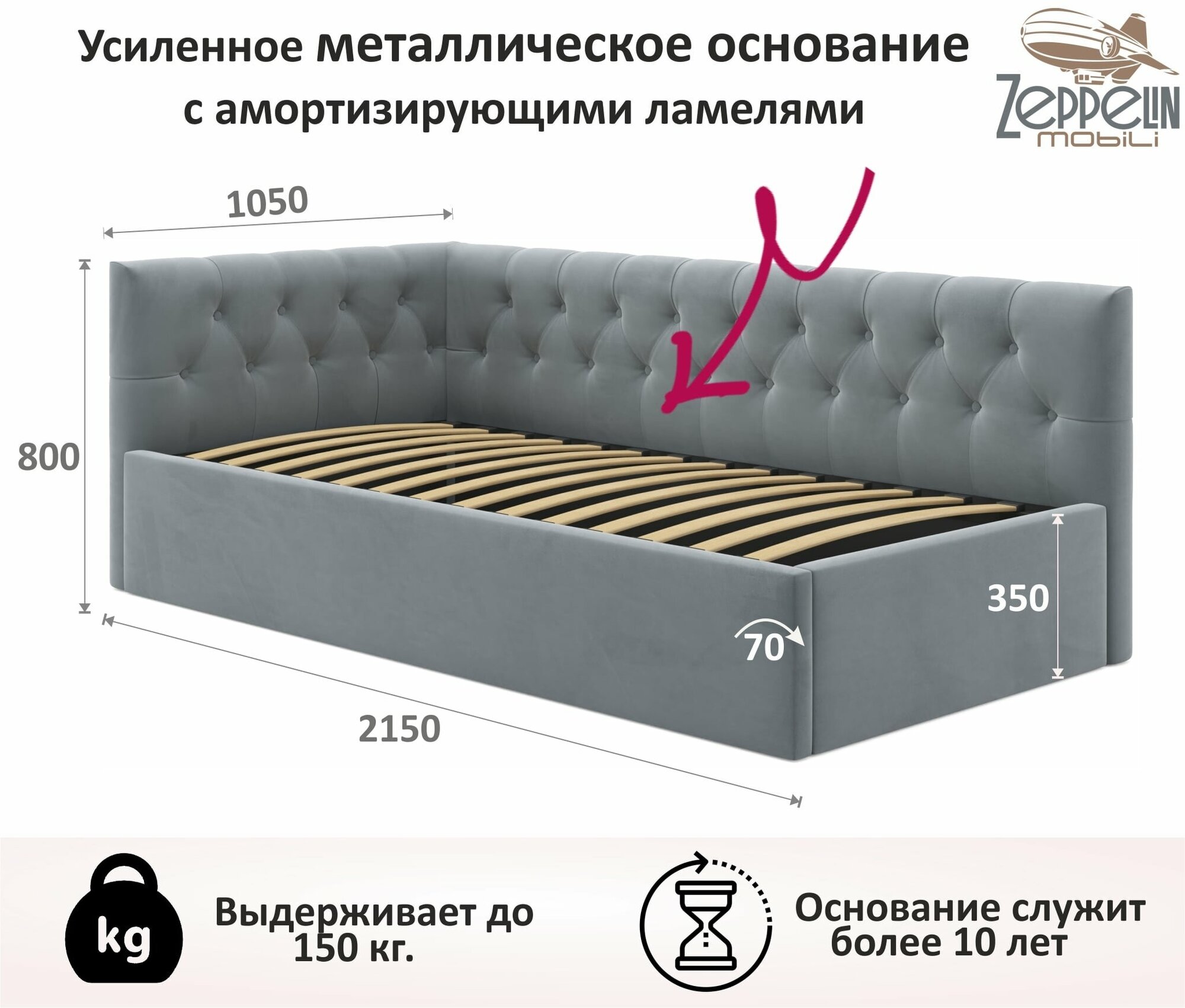 Односпальная кровать-тахта угловая Afelia 900 серая Zeppelin с ортопедическим основанием , 90х200, мягкая из велюра, с ящиками информация: