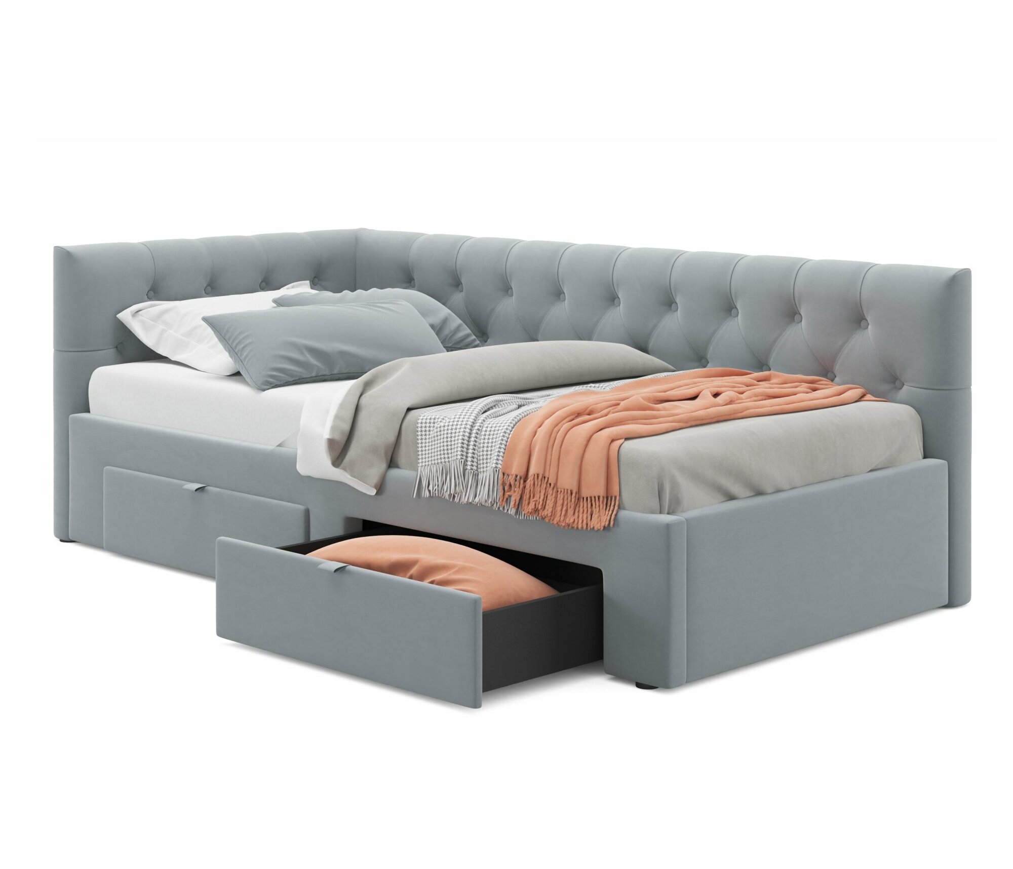 10 цен на Односпальная кровать-тахта угловая Afelia 900 серая Zeppelin с ортопедическим основанием , 90х200, мягкая из велюра, с ящиками