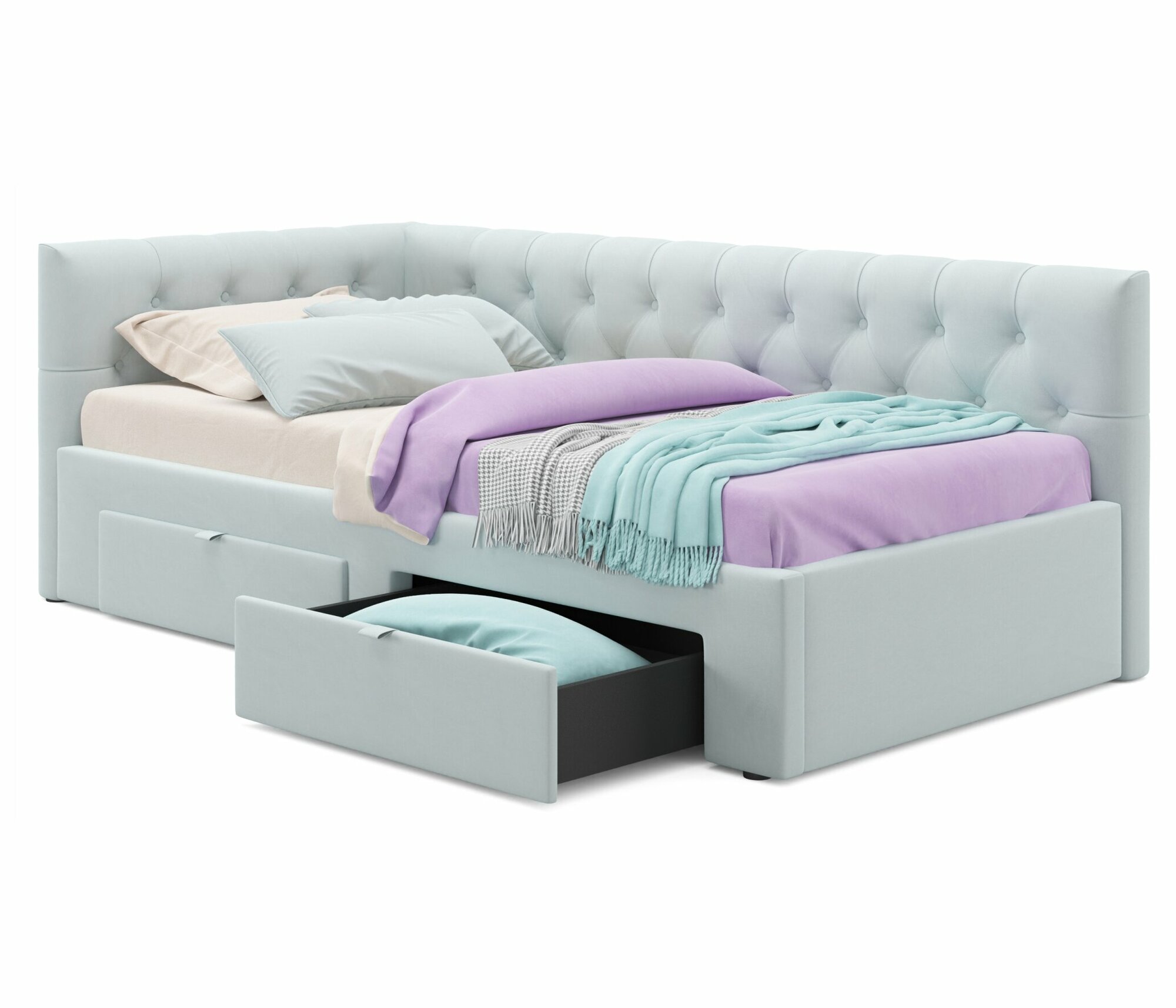 Односпальная кровать-тахта угловая Afelia 900 мята пастель Zeppelin с ортопедическим основанием , 90х200, мягкая из велюра, с ящиками информация: