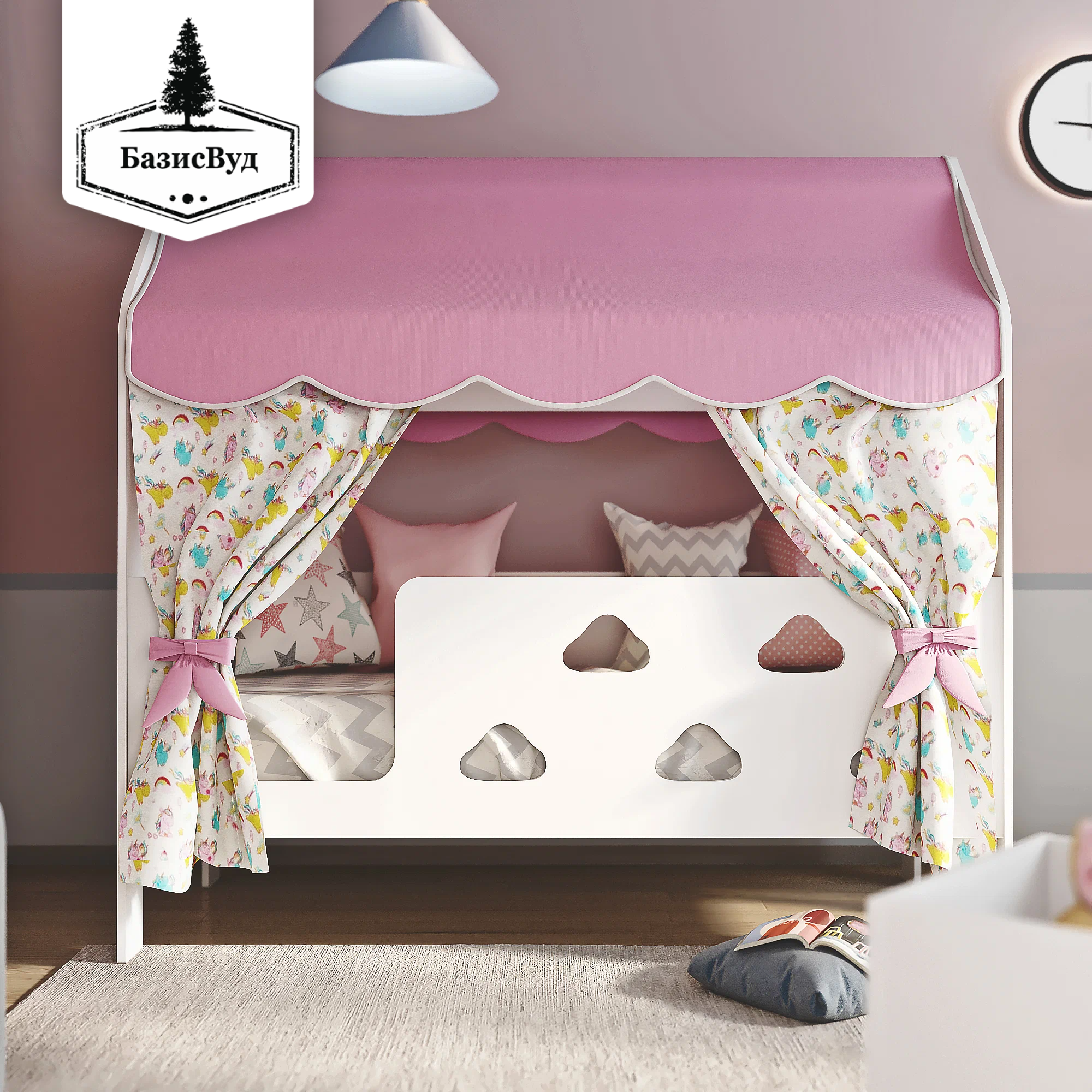 10 цен на Кровать детская домик "Облачка" с текстилем (розовый, с единорогами, вход слева)