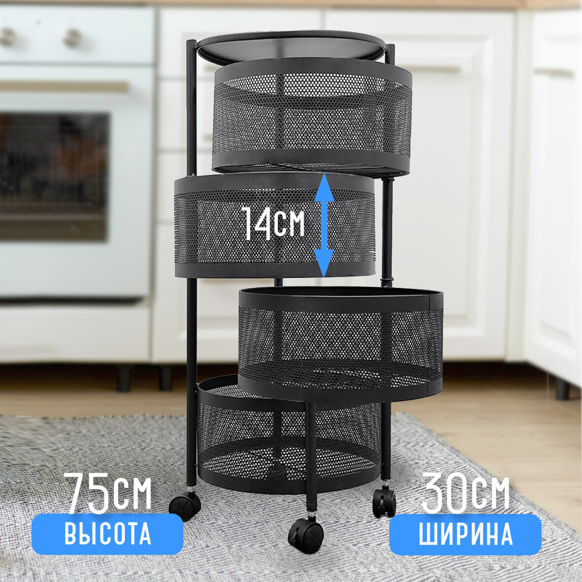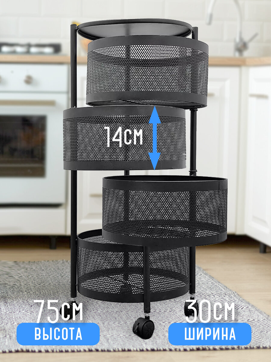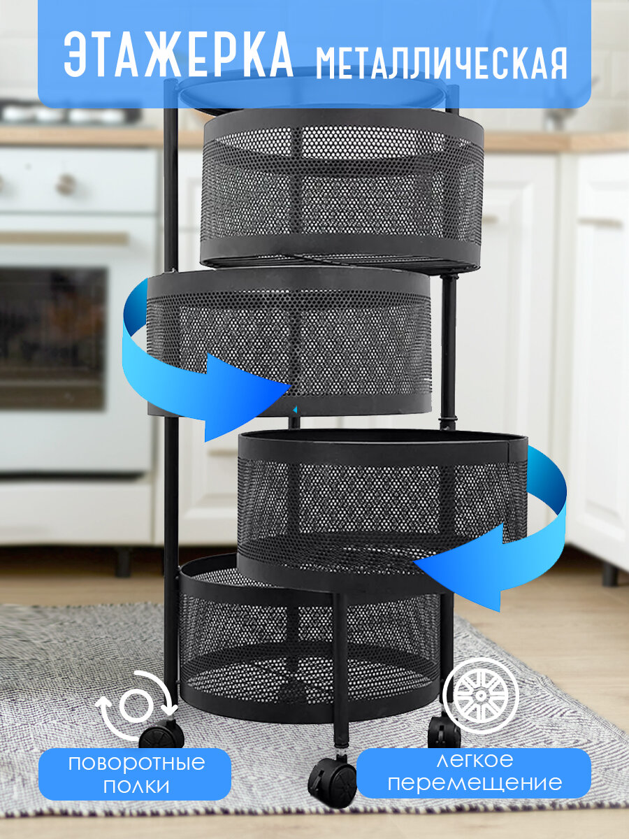 10 цен на Этажерка металлическая 4-х ярусная 32*32*73 круглая на колесах поворотная Baizheng, черный