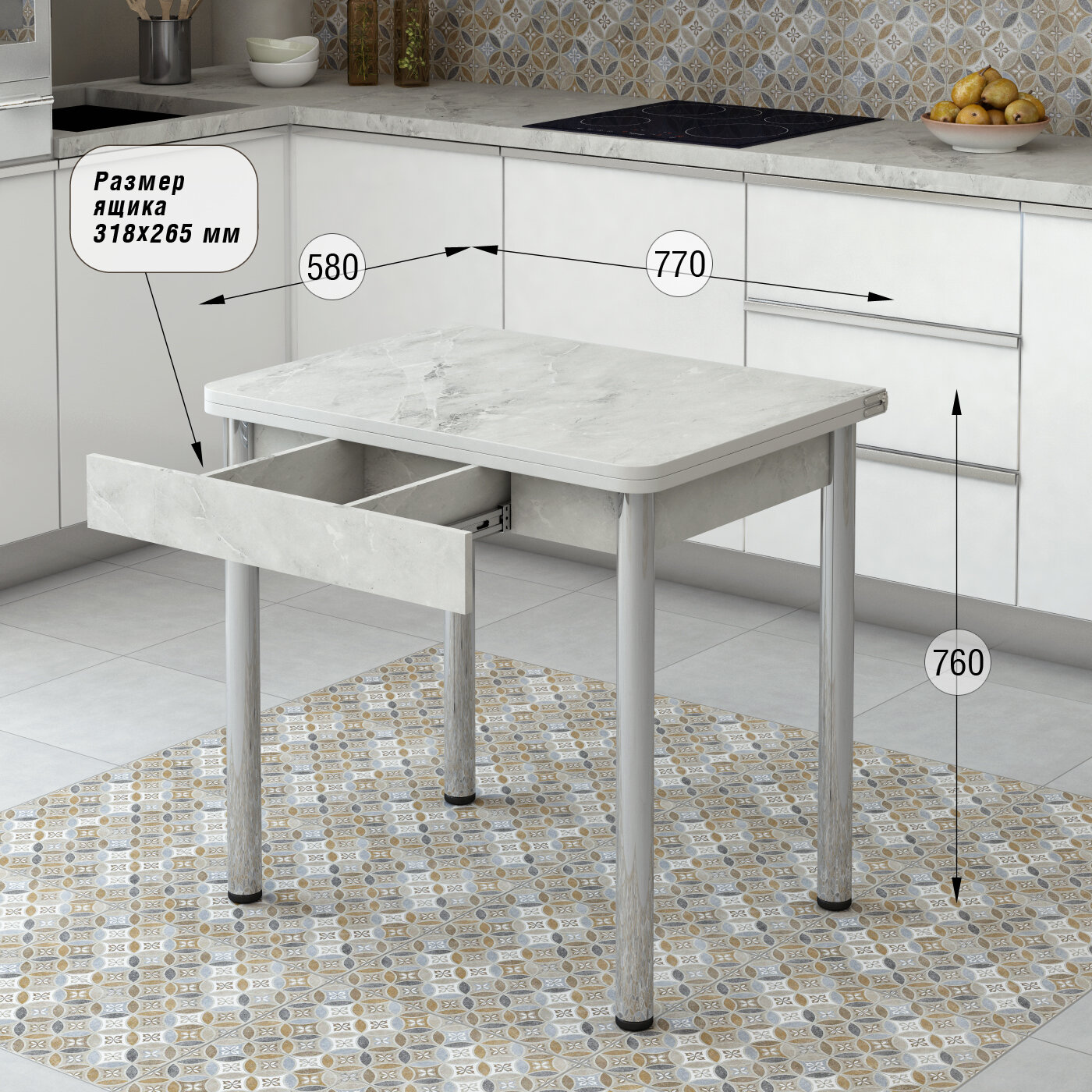Кухонный стол раскладной для кухни, столовой, дачи и дома, ЛДСП, с металлическими ножками, с ящиком, размеры 77х58 см, высота 76 см, КЕА, цвет Венис информация: