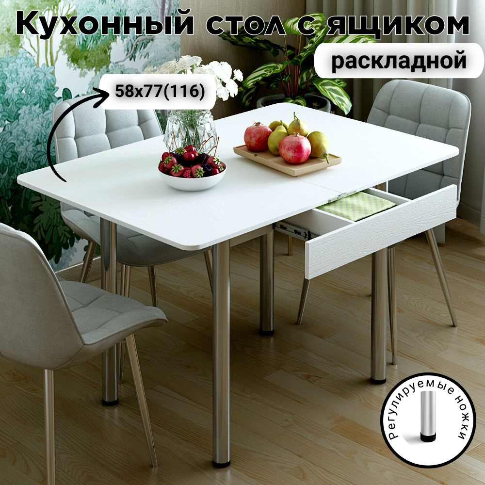 Кухонный стол раскладной для кухни, столовой, дачи и дома, ЛДСП, с ящиком, размеры 77х58 см, высота 76 см, ясень анкор белый 4 909 ₽