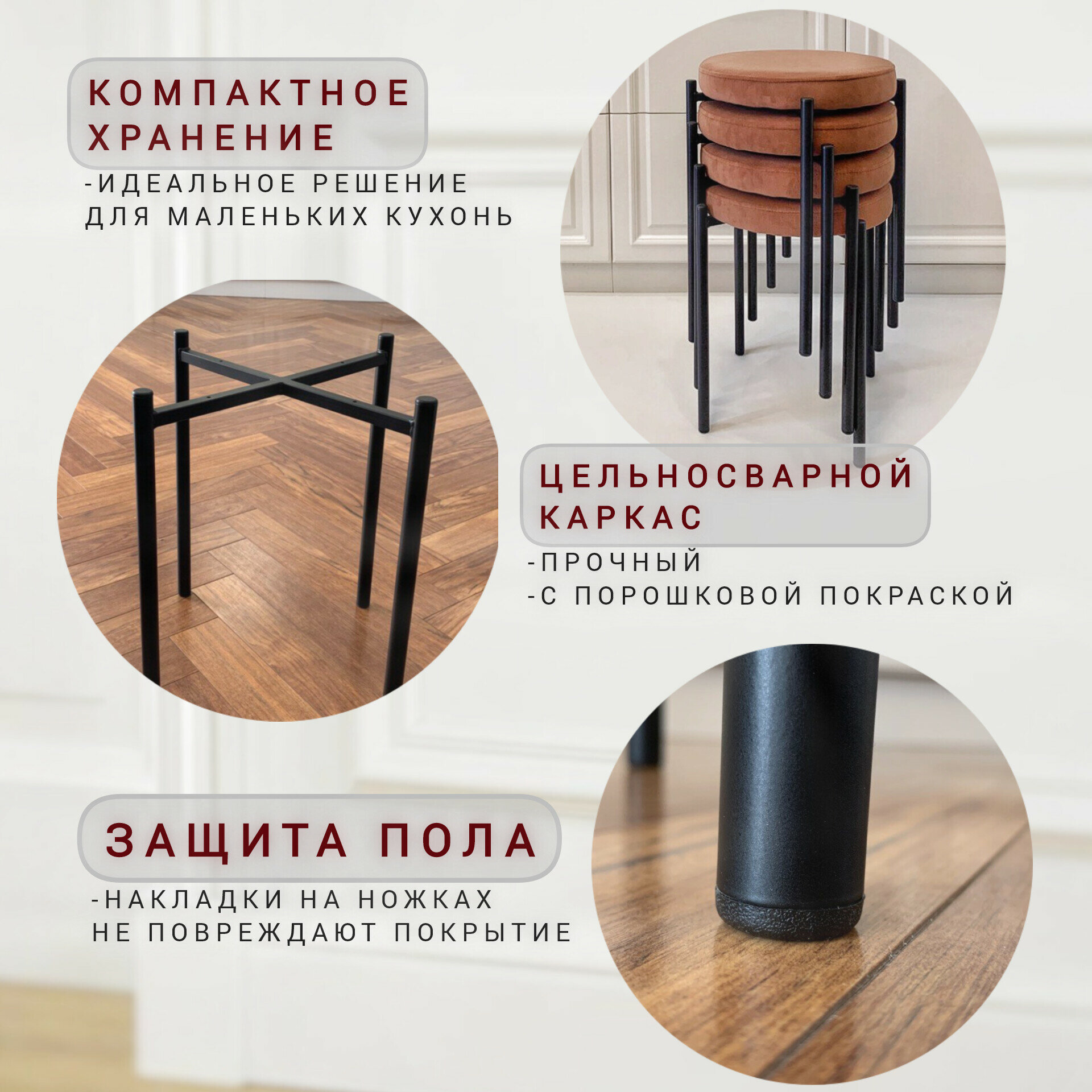 | Комплектация | 4 табурета в разборном виде: сиденье, крестообразная опора, инструкция, винты 4 шт. |
