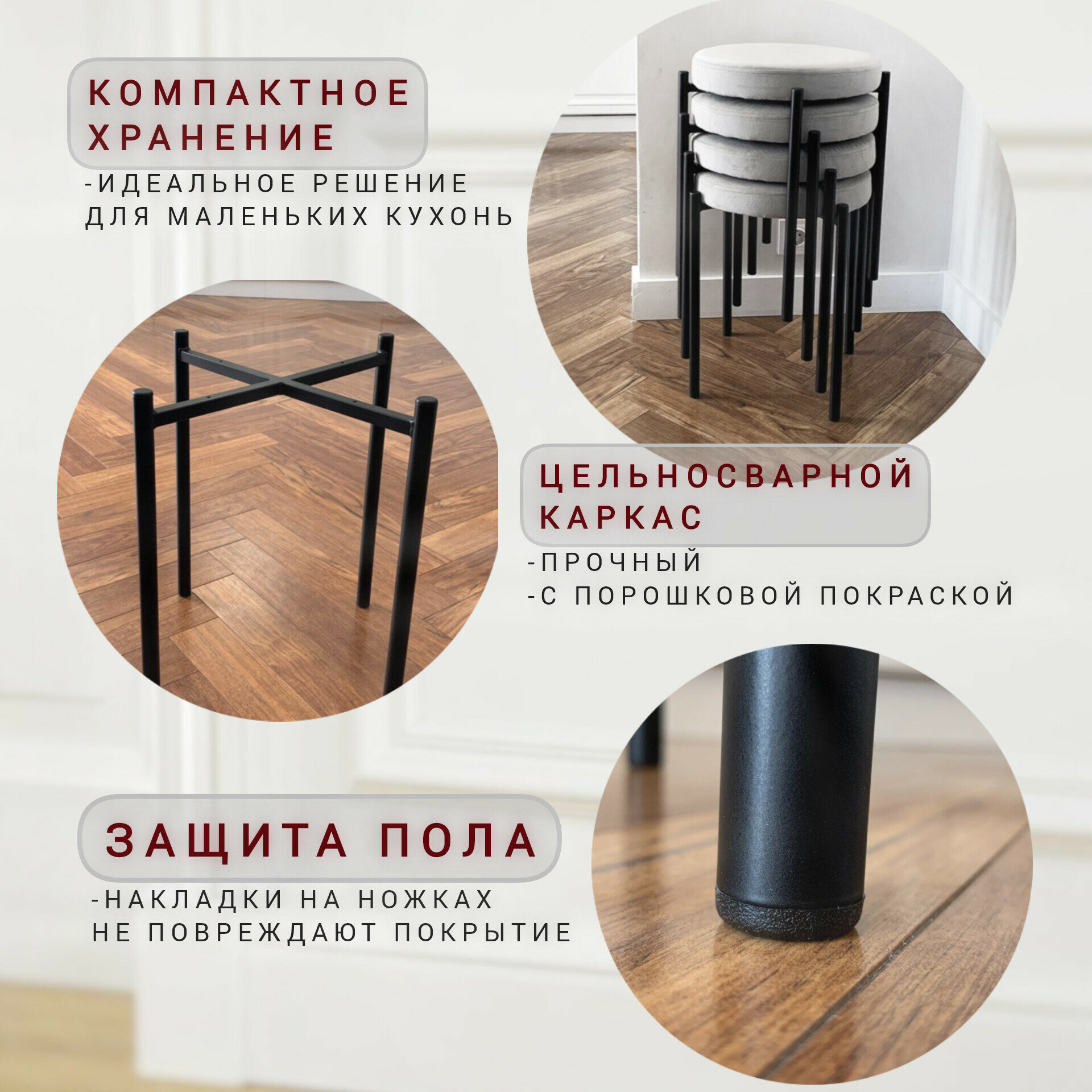 | Комплектация | 4 табурета в разборном виде: сиденье, крестообразная опора, инструкция, винты 4 шт. |