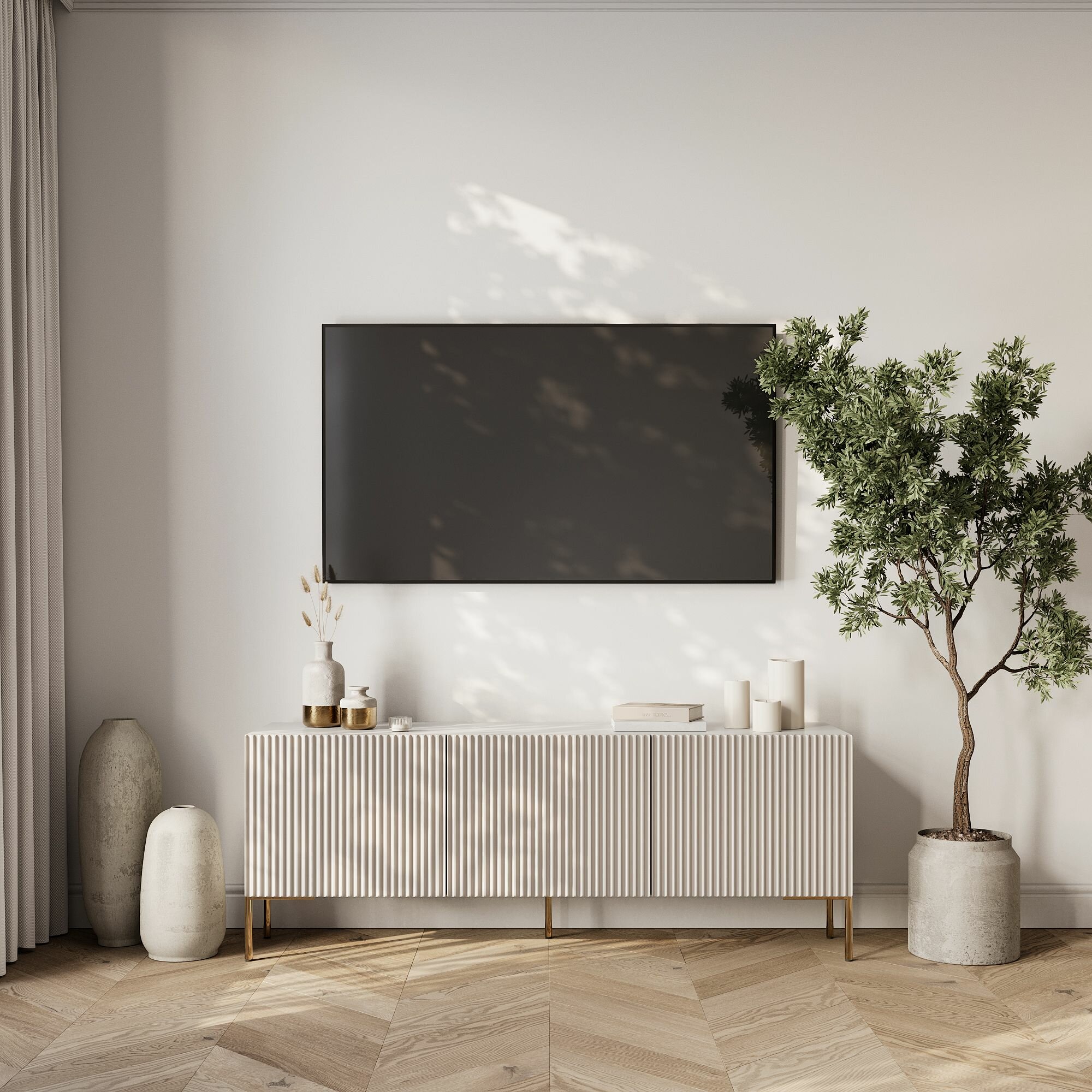 Тумба под телевизор напольная 3 секции белая с бежевыми фасадами рифленая рельефная волна 150*37*57 информация: