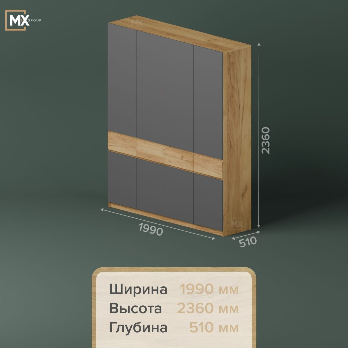 Шкаф распашной четырёхстворчатый Бостон ШК-004 Дуб Крафт золотой/Серый шифер, ЛДСП, с полками, ящиками, штангами, для спальни, гостиной, 1996х2360х510, МК СТИЛЬ информация: