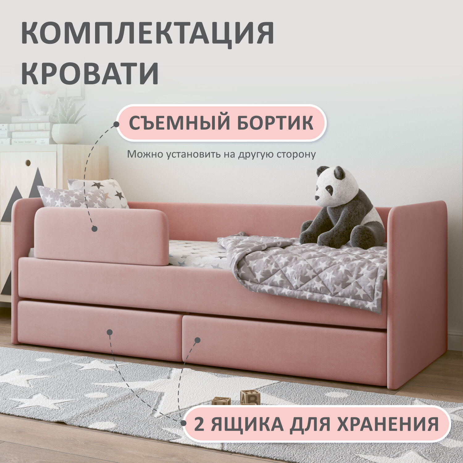 | Комплектация | кровать / выдыижные ящики 2шт / защитный бортик |