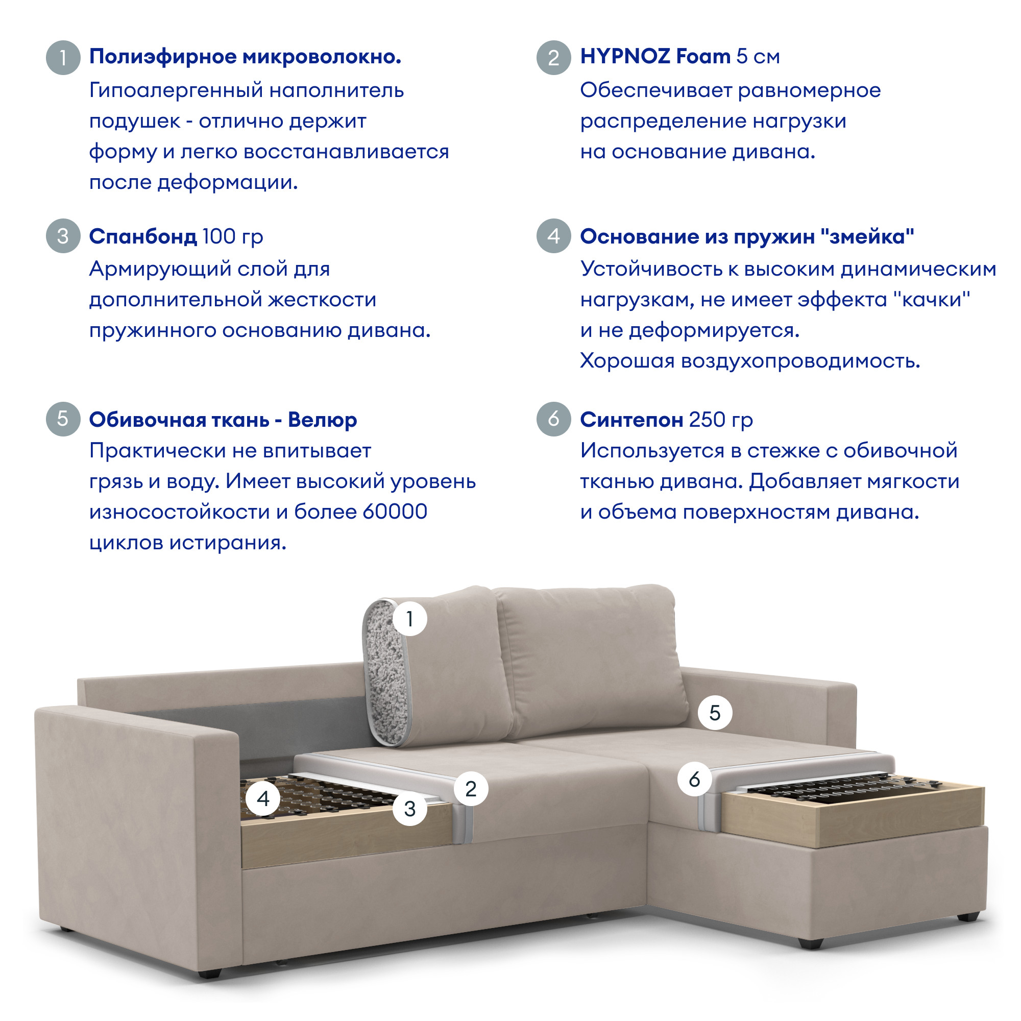 Угловой диван-кровать, HYPNOZ Denver, механизм Дельфин, Светло-бежевый, 221х153х85 см информация: