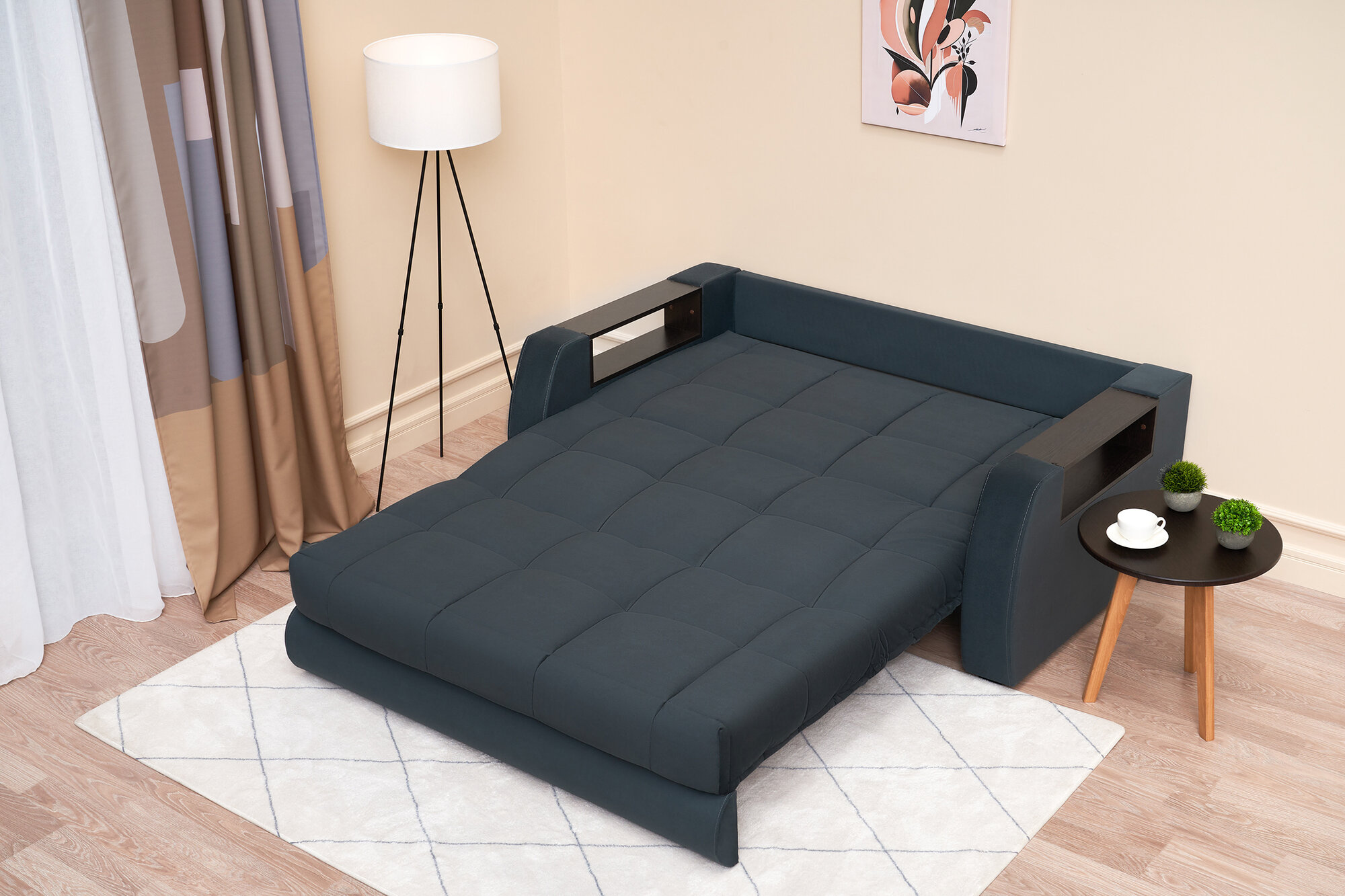 Диван-кровать аккордеон, компактный спальное место 120х200, серый / венге, матрас ППУ, габарит 175 см со столиком и ящиком для белья