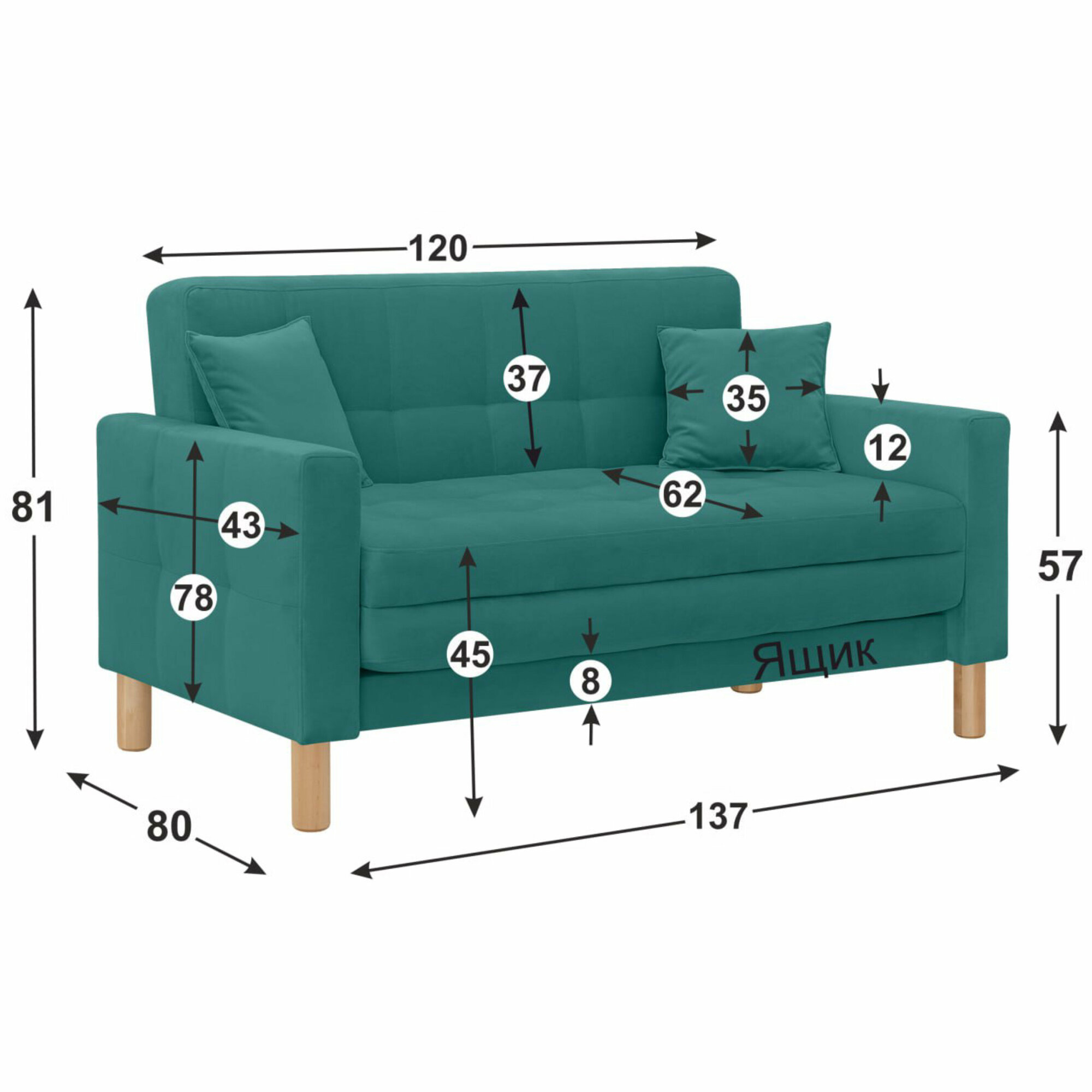 Диван-кровать Монро-макси, прямой, 137*80*81, спальное 120*194, велюр лазурный, Велутто 20 информация: