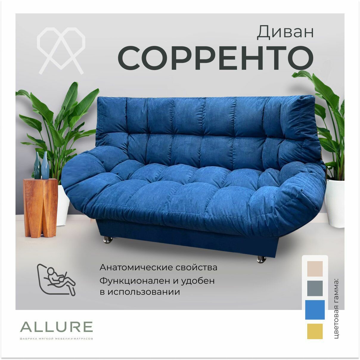 Диван раскладной прямой "Сорренто", 210х100х100, ALLURE, велюр синий, механизм Клик-кляк, подходит для спальни, детской, гостиной, прихожей, дачи, сада, балкона информация: