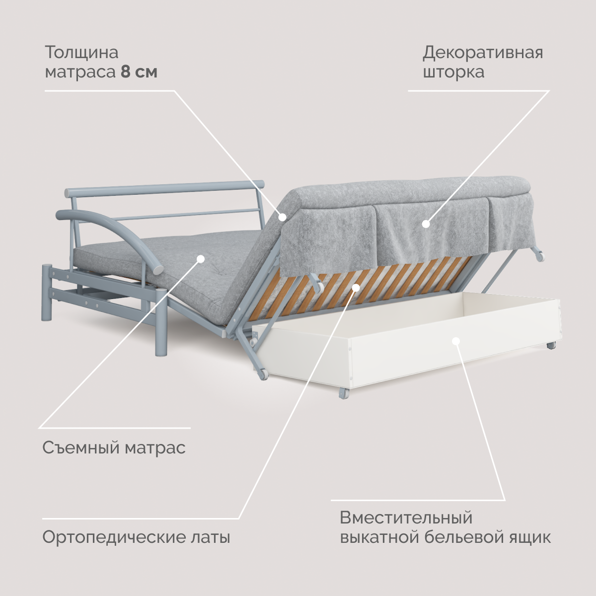 | Особенности | раскладная конструкция, с подлокотниками, ящик для белья |
