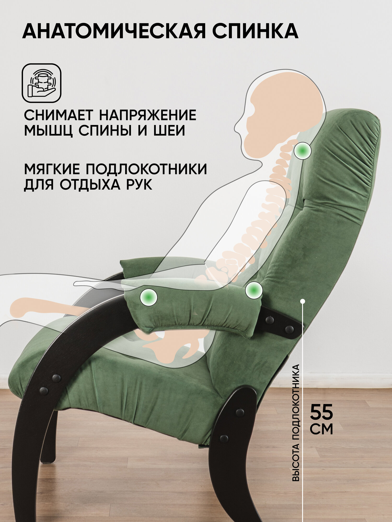Кресло мягкое для отдыха, дома и дачи Glider 61 с мягкими подлокотниками, цвет зеленый/черный информация: