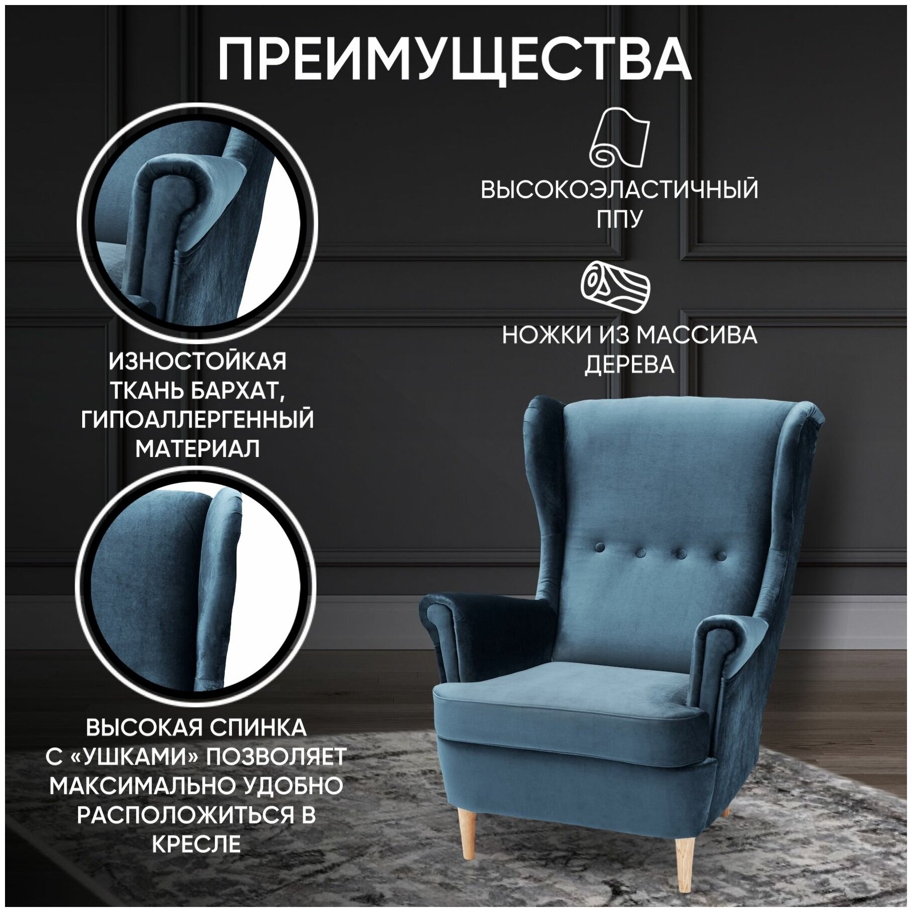 Отзывы на Кресло мягкое интерьерное для отдыха Лорд 79х98х104 см, ножки деревянные, для дома гостиной и дачи, на балкон, обивка бархат синий, Ами Мебель Беларусь